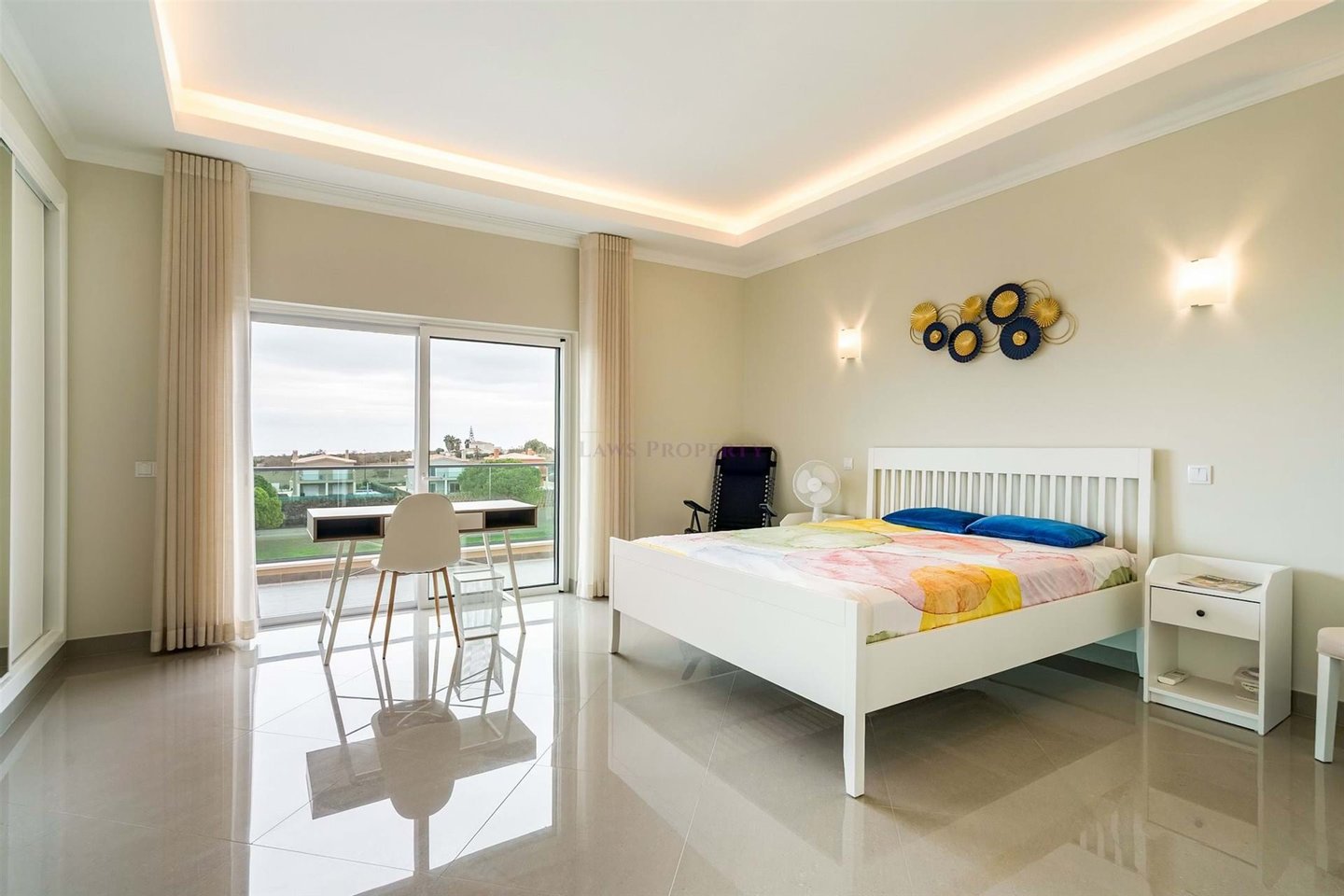 Zwei Balkontüren führen zu einer wunderschönen Außenterrasse mit Blick auf den Golfplatz. Mit seinem herrlichen Ausblick bietet die Terrasse die perfekte Kulisse zum Entspannen, für al-fresco Dining oder zur Unterhaltung von Gästen.