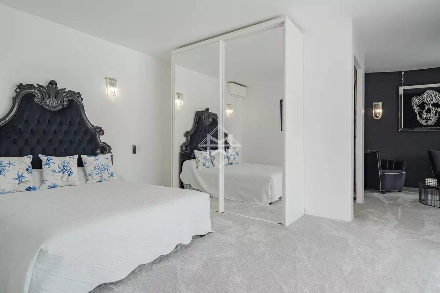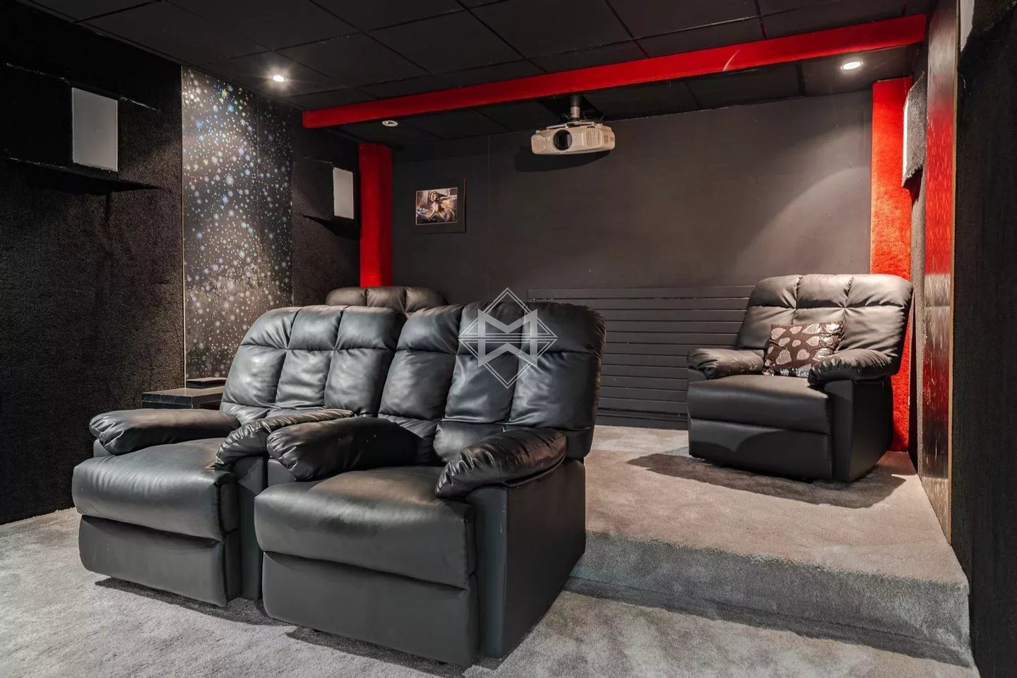 Der Schlafbereich umfasst fünf en-suite Schlafzimmer, darunter eine großzügige Hauptsuite, ein Büro, ein Heimkino und ein Wellnessbereich mit Sauna, die einen seltenen Wohnkomfort im Alltag bieten.