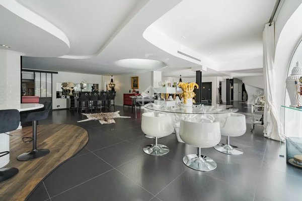 Der Empfangsbereich beherbergt einen großen Wohnbereich von nahezu 240 m², lichtdurchflutet, zum Garten geöffnet, sowie eine hochwertige moderne Küche.