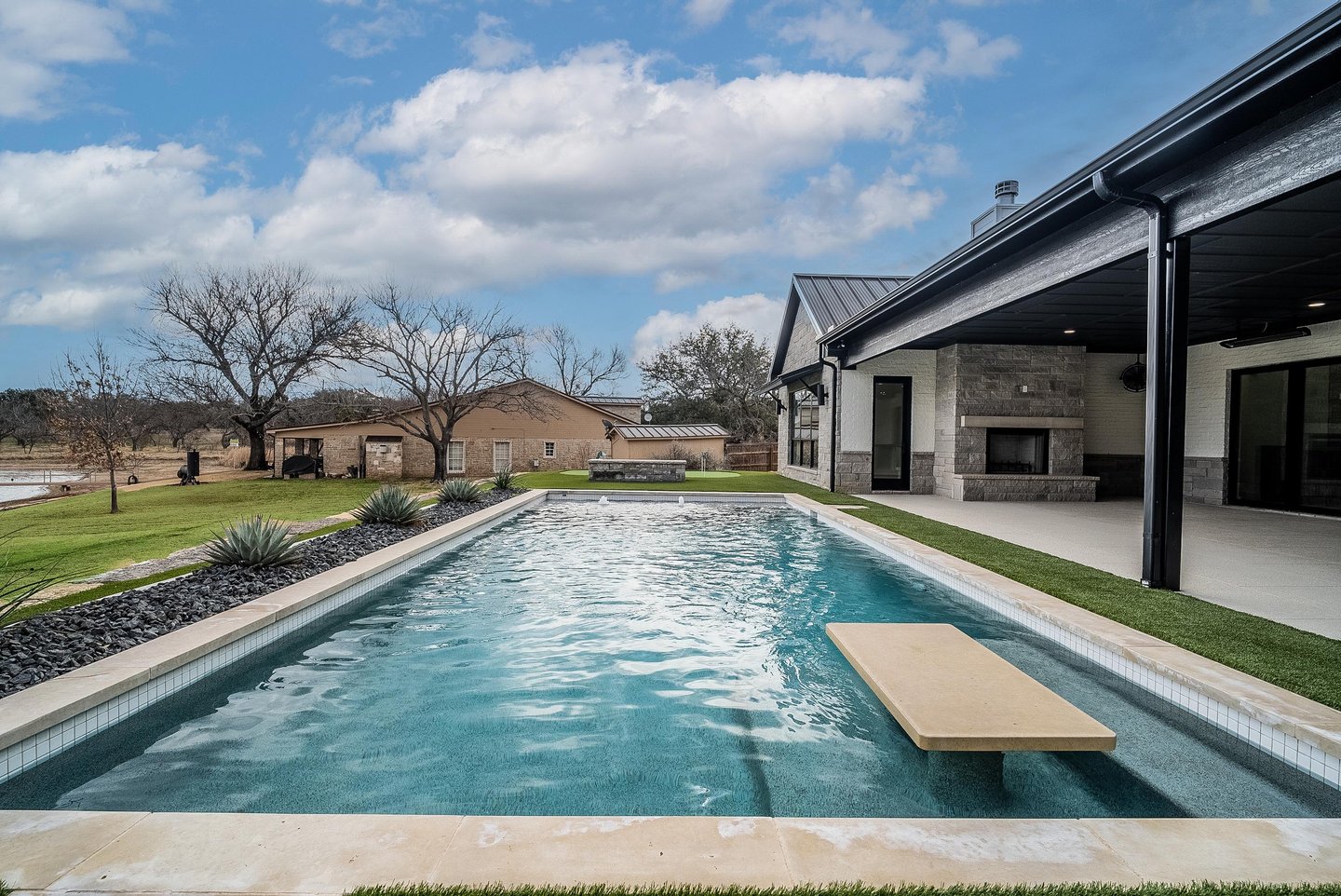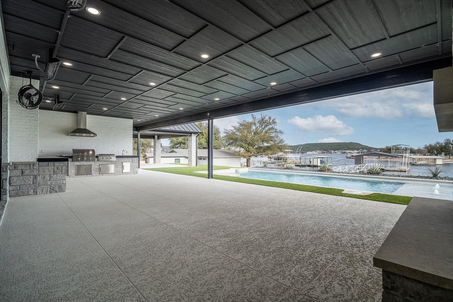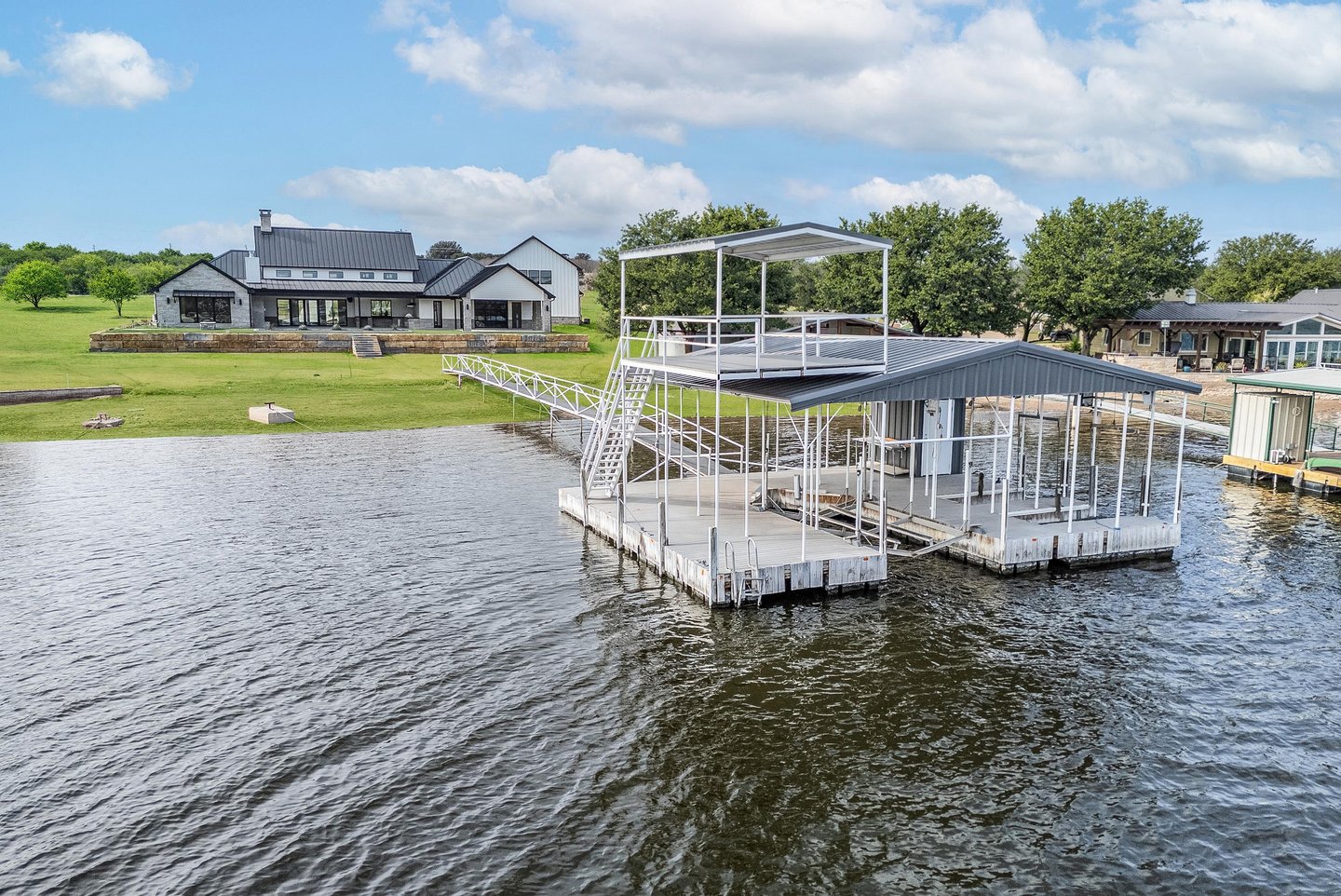 An exceptional lakeside estate awaits within the exclusive gates of Gaines Bend on Possum Kingdom Lake, where refined Texas luxury meets the dramatic beauty of canyon country. This custom Bret Jordan masterpiece delivers uncompromising sophistication across over five thousand square feet, featuring a thoughtfully designed floor plan with a serene primary suite, four beautifully appointed guest rooms, and a separate mother-in-law suite. A stunning bunk room crowns the detached three-car garage, complete with private coffee bar. The gourmet kitchen showcases premium appliances and custom cabinetry, flowing seamlessly to a game room and full bar. Outside, a resort-caliber oasis unfolds with sparkling pool, firepit, and multiple covered patios. A private two-level dock in a tranquil cove provides instant access to world-class boating and water sports, while panoramic lake vistas create an unparalleled backdrop for the ultimate Possum Kingdom lifestyle.