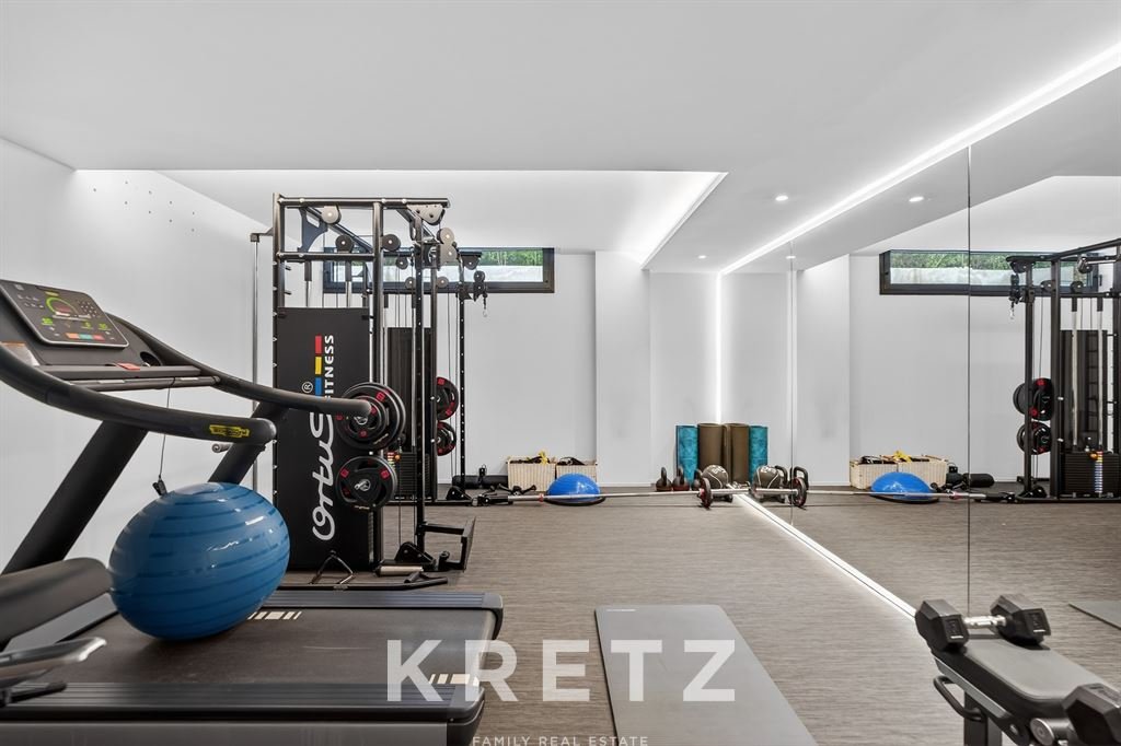 Im Untergeschoss befinden sich zwei weitere geräumige Schlafzimmer mit eigenem Bad, ein großzügiger Fitnessraum und ein beeindruckender Weinkeller mit Platz für mehr als 2500 Flaschen sowie eine Waschküche und eine Garage.
