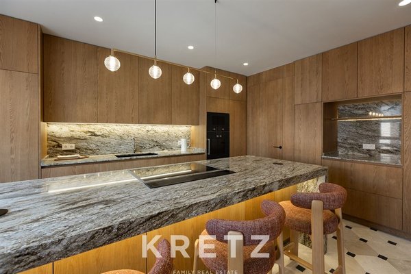 The property occupies the entire fifth floor, offering incredible privacy and spaciousness. The entrance opens into a grand foyer that connects all wings of the home. The open-concept living room, dining area, and kitchen receive abundant natural light. One wing features three en-suite bedrooms, while the other hosts a large primary suite with a walk-in closet and a stunning bathroom. Additionally, there is a staff bedroom with its own private bathroom and a laundry room.