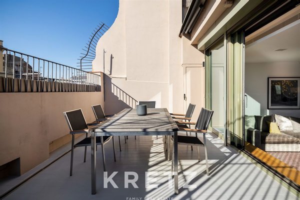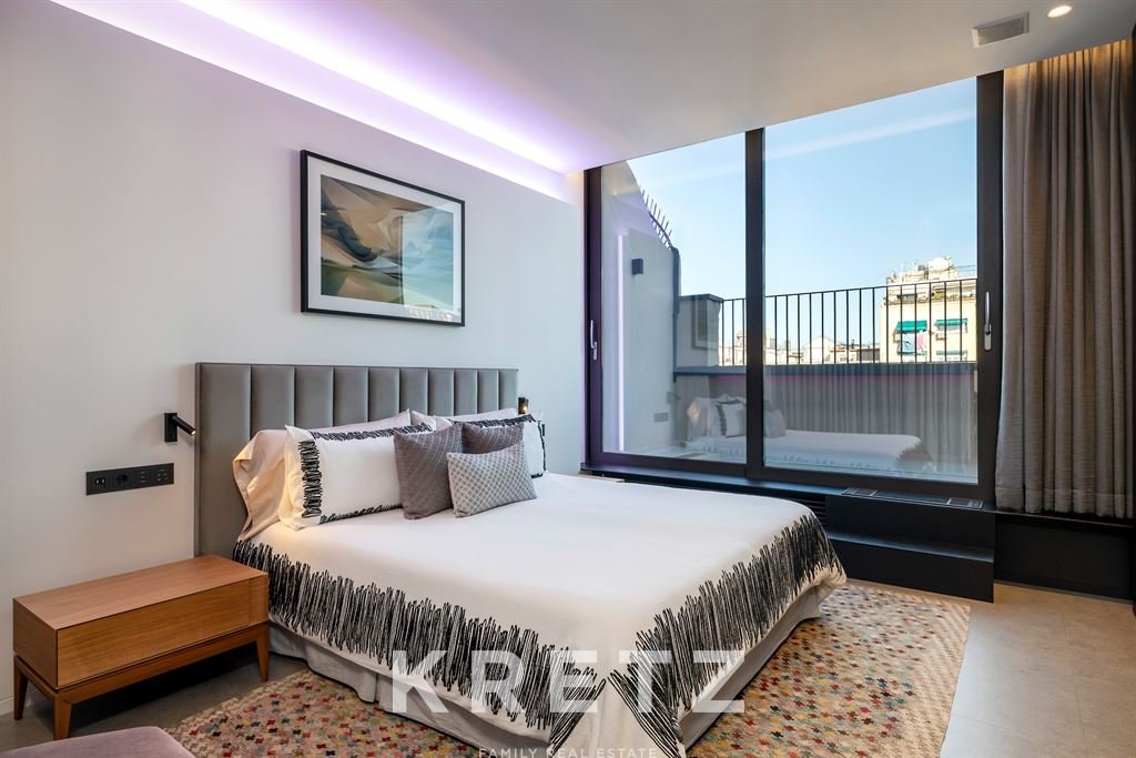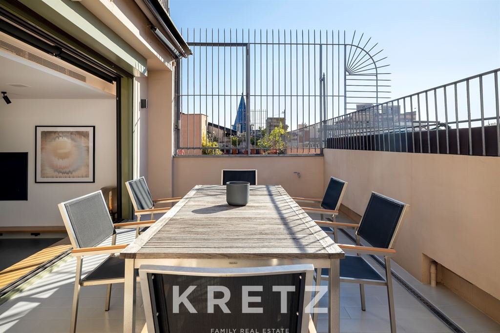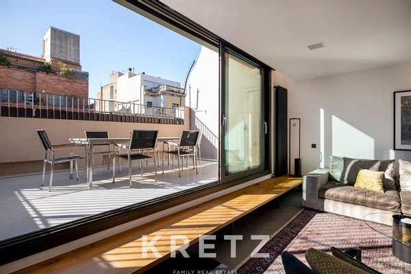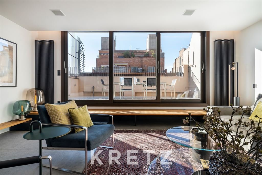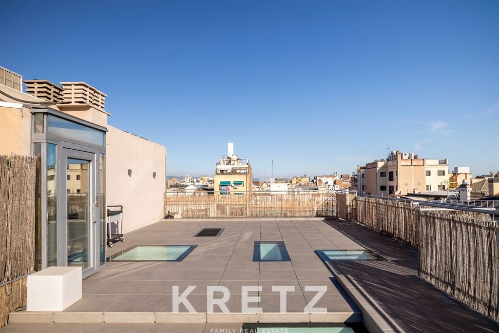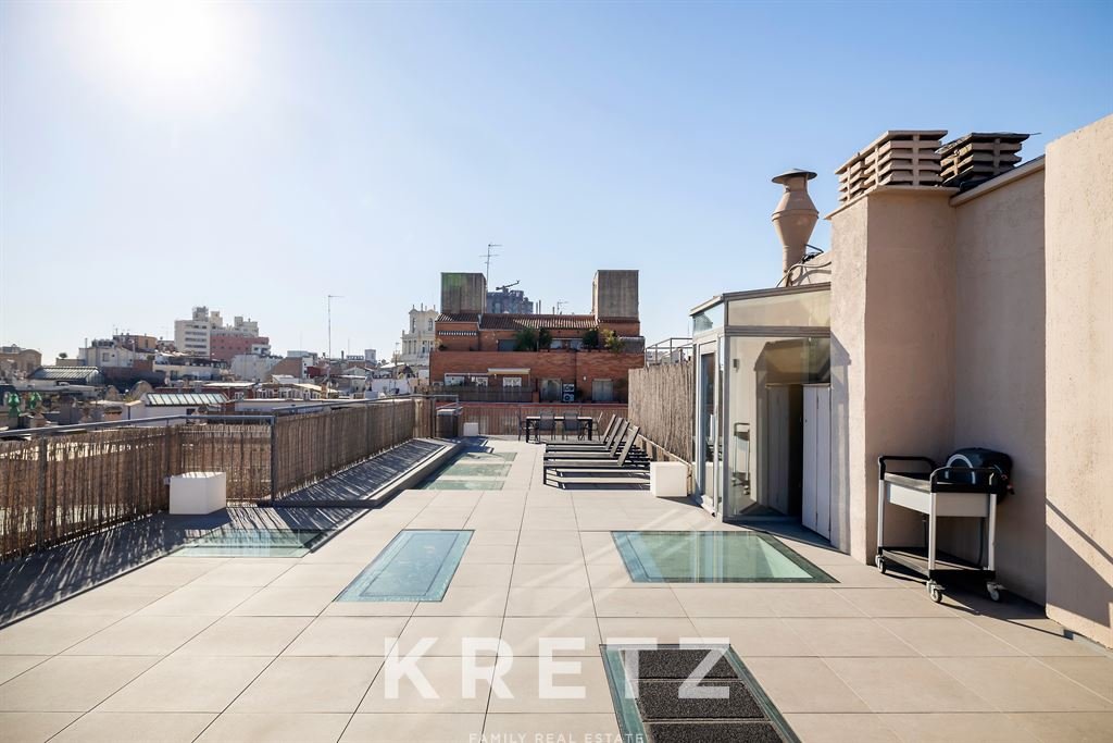 In a modern and exclusive building located in the very heart of the city, this 146 m² penthouse offers direct access to a 30 m² terrace. The residence features contemporary design and top-level finishes. A living room flooded with natural light and a dining area open to a fully equipped American kitchen. Two en-suite bedrooms. A private 146 m² rooftop with a pool and panoramic views over all of Barcelona, in one of the city’s most coveted neighbourhoods.