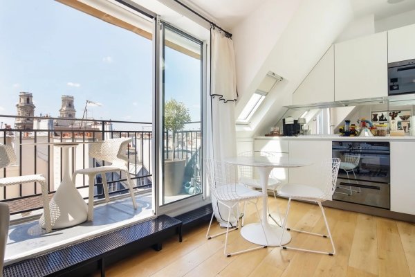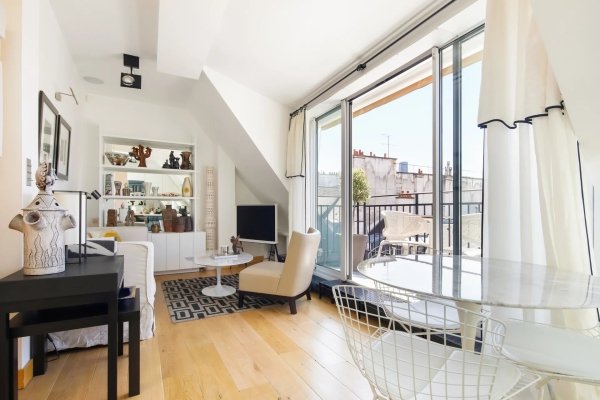 Wohnzimmer, das auf einen Balkon mit Blick auf die Kirche Saint-Sulpice ausgerichtet ist