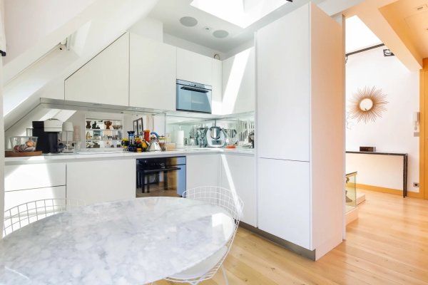 In einem Gebäude aus dem Jahr 1850, im 6. und obersten Stockwerk mit einem Aufzug bis zum 5. Stockwerk, befindet sich eine 56 m² große Kreuzungswohnung im Stockwerk (45,79 m² Carrez) mit ungehindertem Blick auf die Kirche Saint-Sulpice und den Place