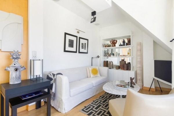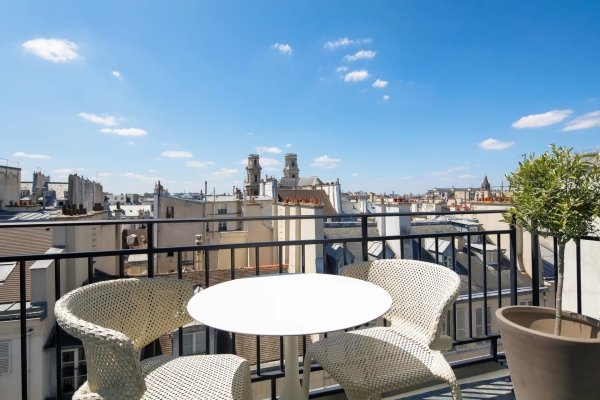 Wohnzimmer, das auf einen Balkon mit Blick auf die Kirche Saint-Sulpice ausgerichtet ist