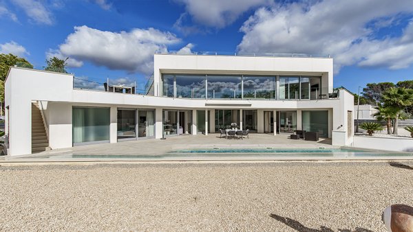 Meerblick & direkter am Meer, großer Pool mit Sonnenterrasse, überdachte Terrassenbereiche, Aufzug über alle Ebenen, Bodentiefe Fensterfronten, Domotik-System (Smart Home) mit Elektrische Jalousien, LED-Beleuchtung im Innen- und Außenbereich und Heizung, Markisen, Glasgeländer, Kühlkammer, Gäste-WC und große Garage