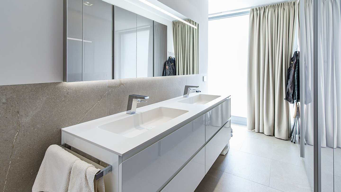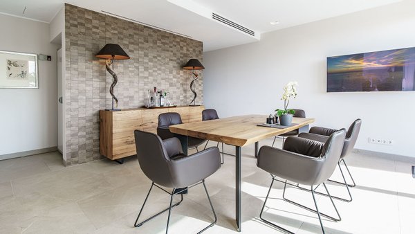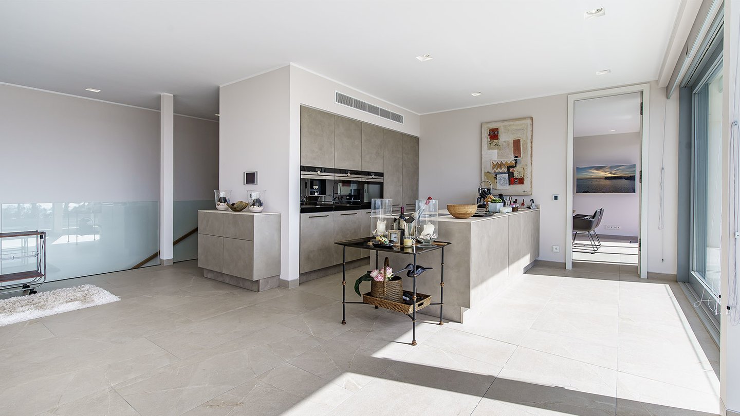 Hier befindet sich der großzügige Wohn- und Essbereich mit offener Designküche der Marke Nolte und hochwertigen Miele und Bora-Geräten. Ein weiteres Schlafzimmer mit Bad en Suite, ein Gäste-WC sowie der Zugang zu einer großen Terrasse. Auf der gesamten Ebene genießen die Bewohner einen herrlichen Meerblick.