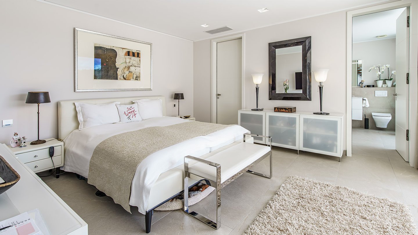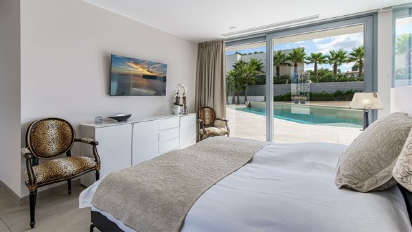 Im Eingangsbereich empfängt Sie ein stilvolles Entree, das in den privaten Schlafbereich und zur sehr großzügigen Poolterrasse führt. Das Hauptschlafzimmer verfügt über eine Ankleide und ein luxuriöses Badezimmer en Suite. Zwei weitere Schlafzimmer, jeweils mit eigenem Bad, komplettieren diese Ebene.
