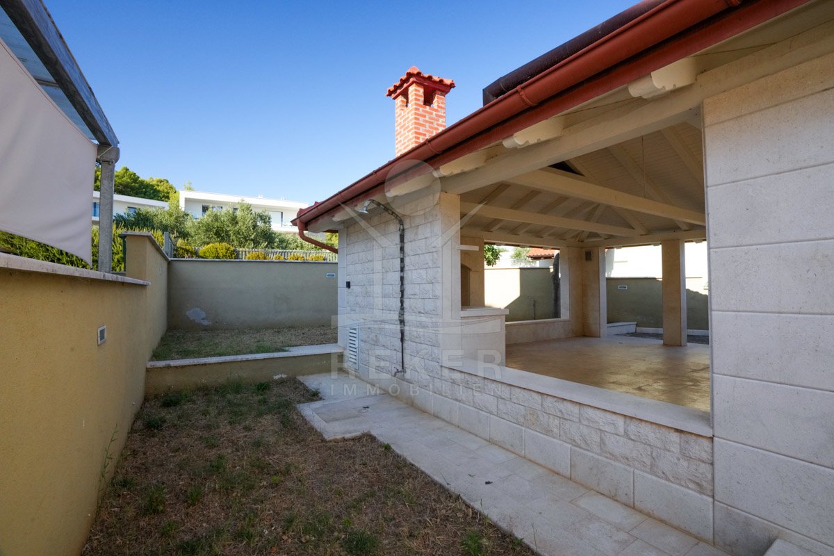 Der Außenbereich ist auf Familienleben ausgelegt. Ein 11 × 5 Meter großer Pool bildet das Herzstück der Anlage, ergänzt durch ein separates Kinderbecken. Die überdachte Terrasse schafft einen geschützten Platz für entspannte Stunden im Freien und gemeinsame Tage am Wasser.