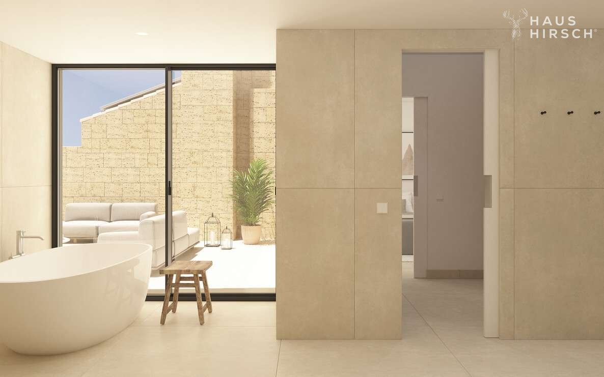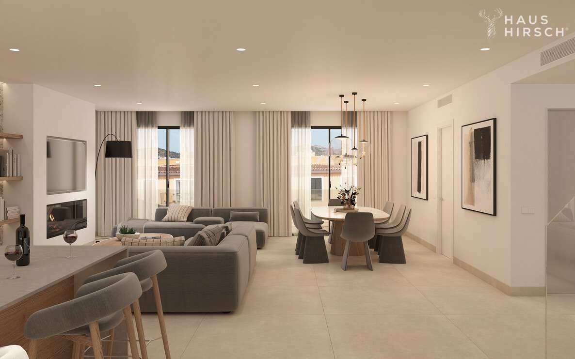 Die gehobene Ausstattung der Wohnung lässt keine Wünsche offen. Ein Highlight ist der offene Wohn- und Essbereich mit einer offen gestaltenen und voll ausgestatteten Einbauküche. Von hier aus geht es ebenfalls direkt hinaus auf die große Terrasse, auf der Sie die Sonne und die Ruhe genießen können. Über eine innenliegende Treppe gelangt man zudem vom Wohnzimmer auf die große Dachterrasse. Hier ist Platz für einen großen Esstisch, eine Outdoorküche und weitere Sonnenliegen.