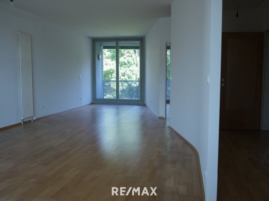 Ein großer Raum, der auch die offene Küche beinhaltet, führt bis zur gegenüberliegenden Seite der Wohnung, wo sich einer der beiden Ausgänge auf die Loggia befindet. Die Loggia zeigt in Richtung Westen in den großen Garten und somit direkt ins Grüne. Ruhe und die Möglichkeit sich von einem anstrengenden Arbeitstag erholen zu können sind hier garantiert!