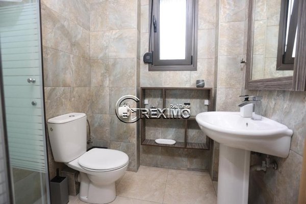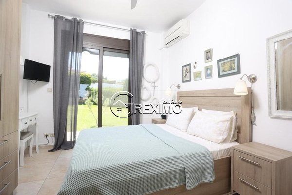 Auf einem privaten Grundstück von 600 m² gelegen, bietet die Villa einen schön gepflegten Garten und einen privaten Swimmingpool. Die großzügigen Außenbereiche eignen sich ideal für Familienmomente und Sommerfeiern. Die Lage ist ein entscheidender Vorteil – nur 500 Meter vom Sandstrand von Hanioti entfernt und in der Nähe von Restaurants, Geschäften und allen Urlaubsanlagen.