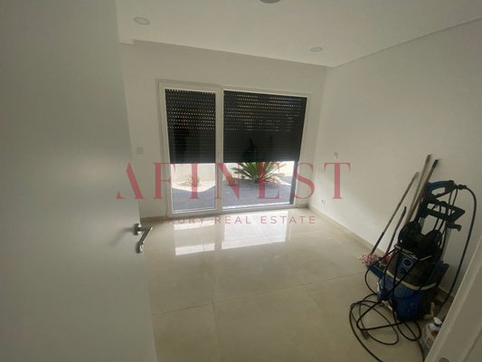 Die Villa verfügt über einen angenehmen Außen-Gartenbereich mit Palmen- und Zierbäumen, der eine moderne und entspannte Atmosphäre schafft.