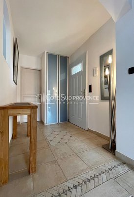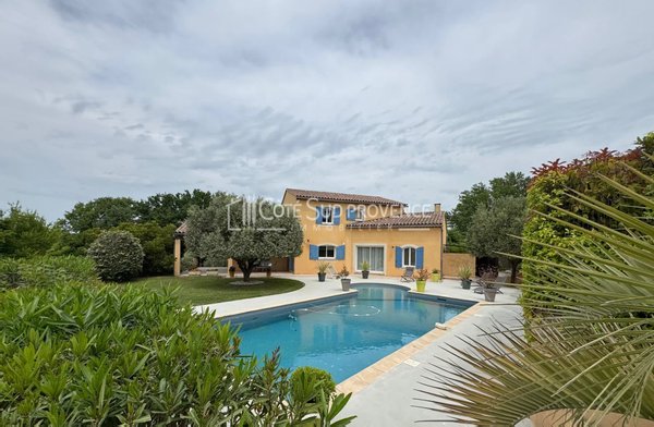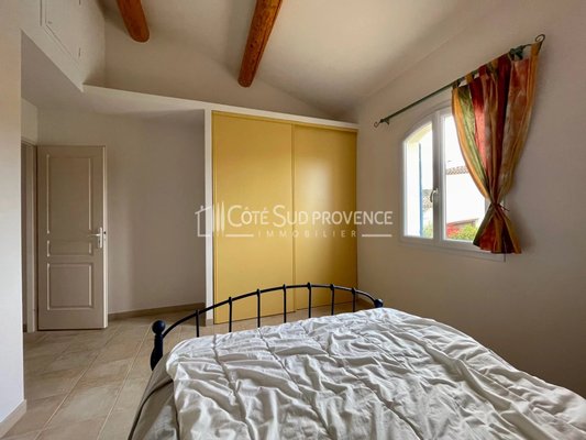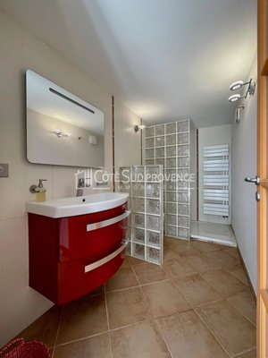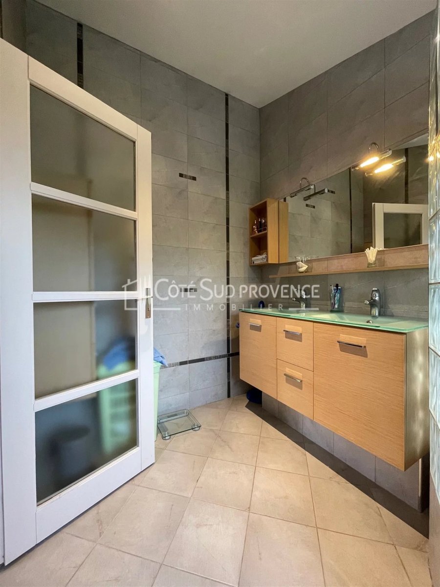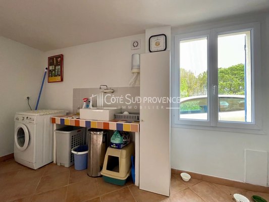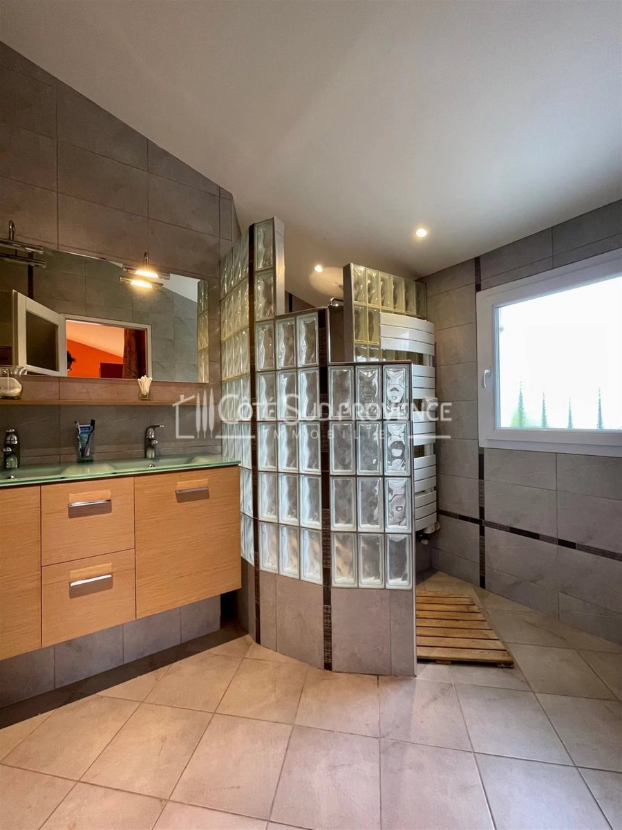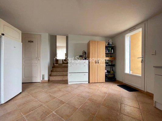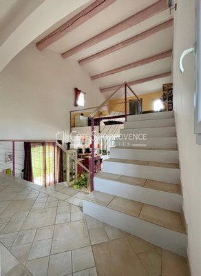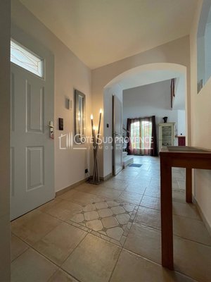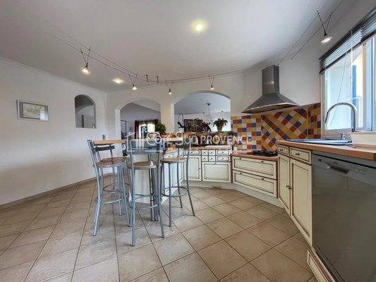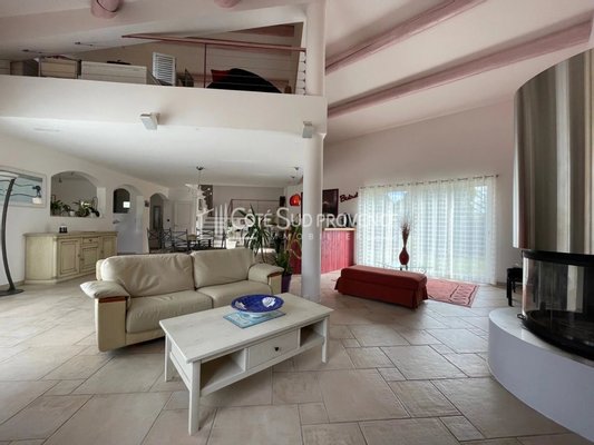 In ruhiger Lage, 40 Minuten vom TGV Avignon, Süd-Mont-Ventoux und 15 Minuten von Gordes, alle Geschäfte zu Fuß im Dorf Saint-Didier. Moderne Villa, 2005 erbaut, ca. 240 m² auf zwei Ebenen, Eingangshalle, separates WC, Einbauküche von 21 m² offen zum