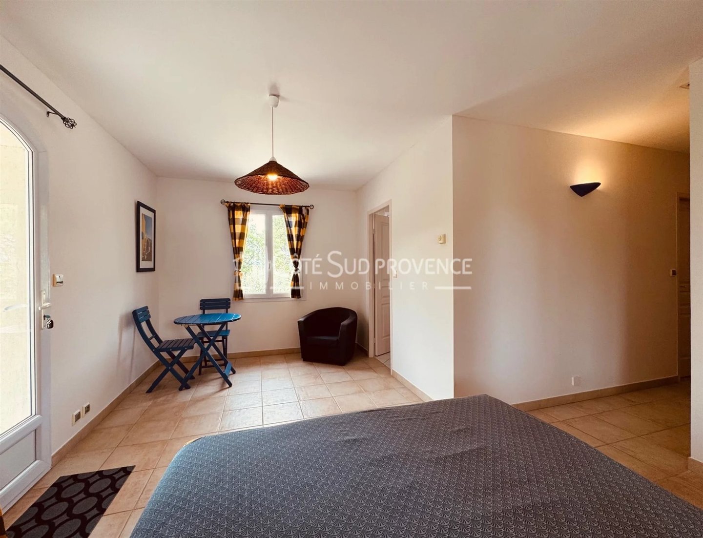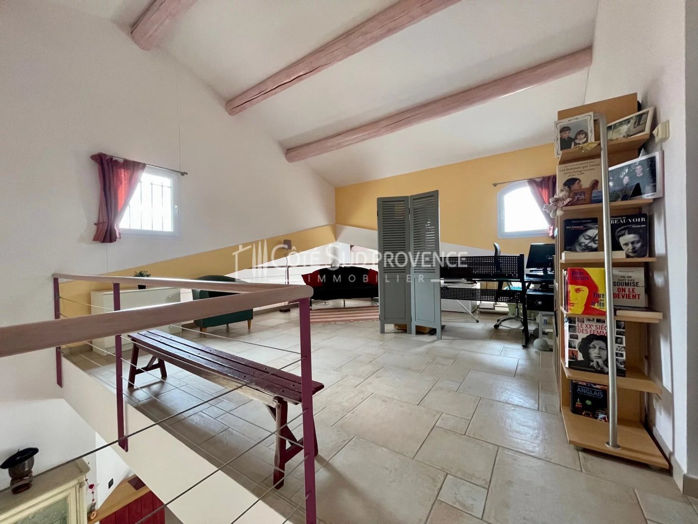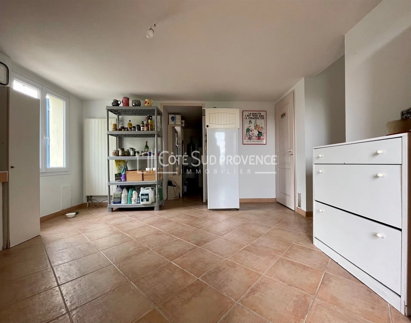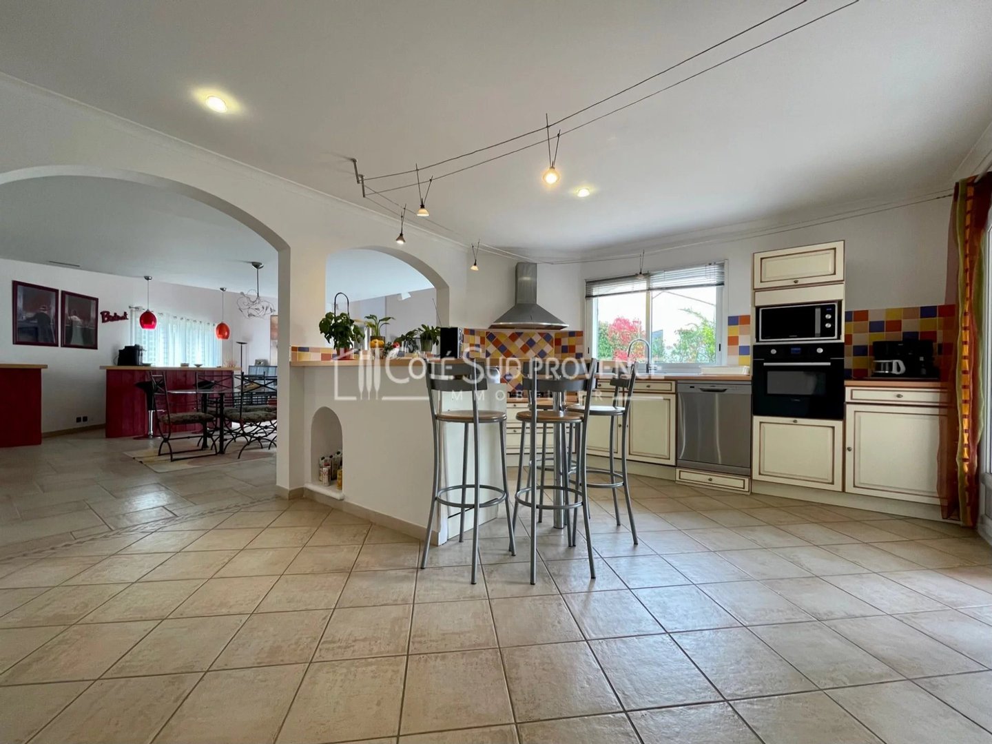 In ruhiger Lage, 40 Minuten vom TGV Avignon, Süd-Mont-Ventoux und 15 Minuten von Gordes, alle Geschäfte zu Fuß im Dorf Saint-Didier. Moderne Villa, 2005 erbaut, ca. 240 m² auf zwei Ebenen, Eingangshalle, separates WC, Einbauküche von 21 m² offen zum