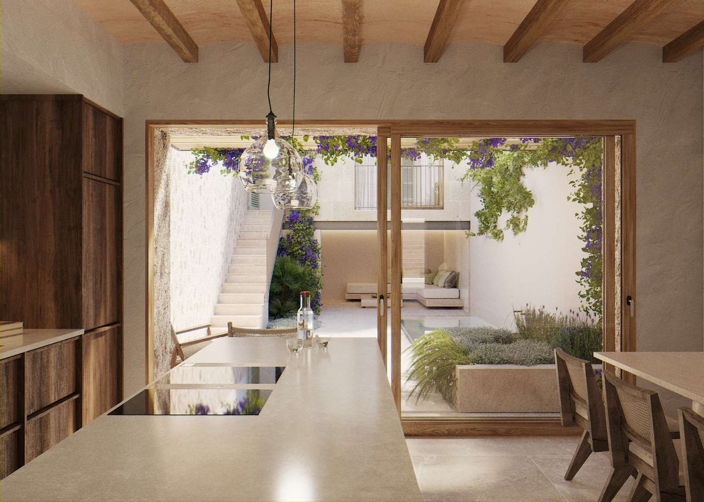 Im Erdgeschoss öffnet sich ein lichtdurchfluteter Wohn- und Essbereich mit offener Küche. Große Türen führen direkt in den Patio, wo ein Pool mit etwa 8 m² Wasserfläche und eine Loungezone eine ruhige mediterrane Atmosphäre schaffen. Über eine Außentreppe erreicht man ein separates Gästezimmer mit eigenem Bad – ideal als Atelier, Büro oder privater Rückzugsort.