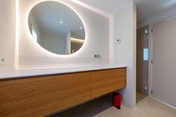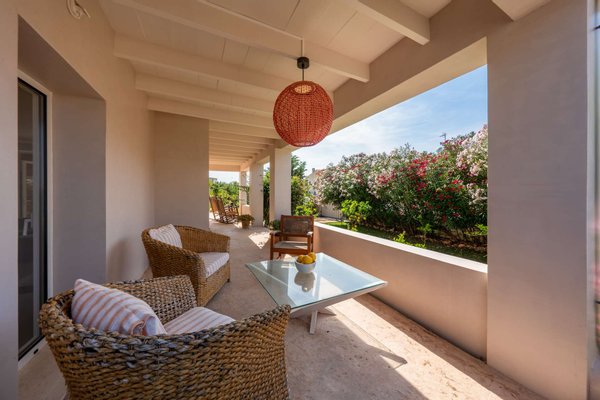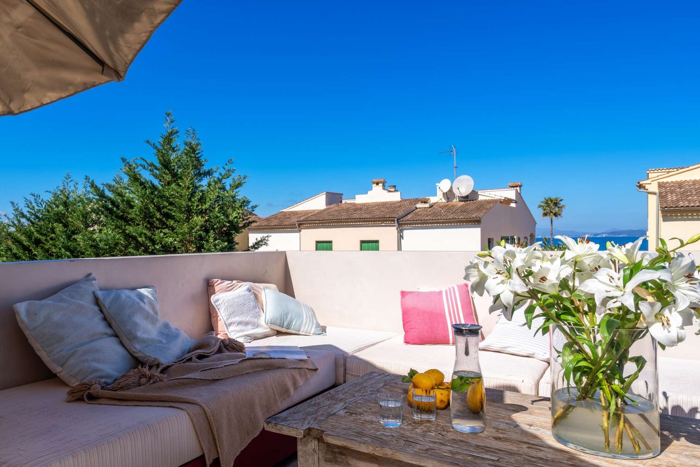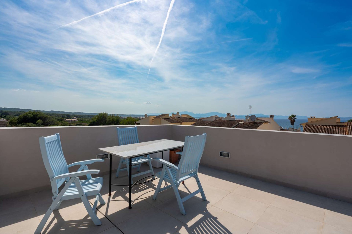 Die Dachterrasse bildet den höchsten Punkt des Hauses. Von hier öffnet sich ein weiter 360-Grad-Blick über die Landschaft. Die Sonnenuntergänge über der Bucht, die sanften Berge des Puig de Ferrutx im Hintergrund und das angrenzende Naturschutzgebiet verleihen diesem Ort eine besondere Atmosphäre.