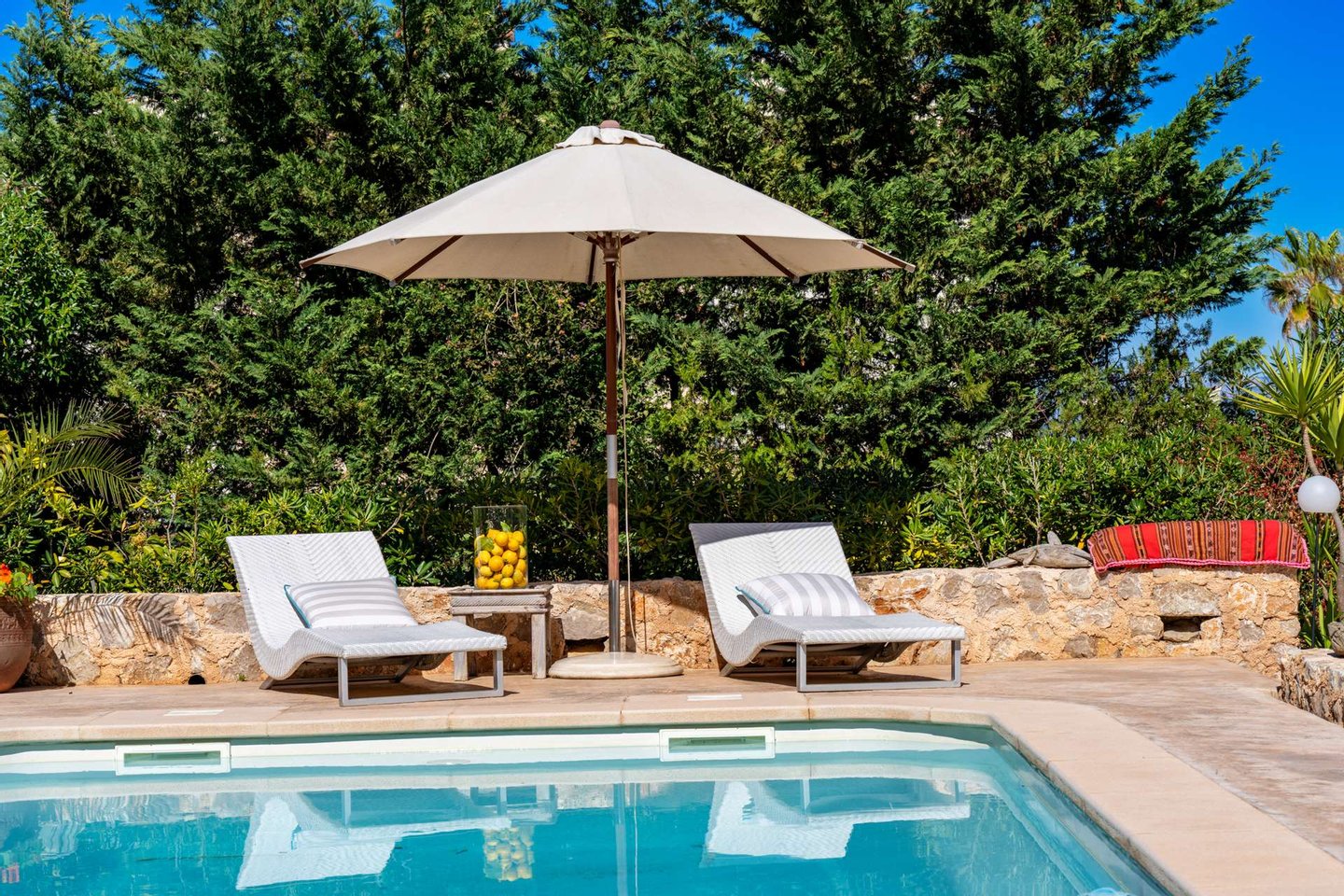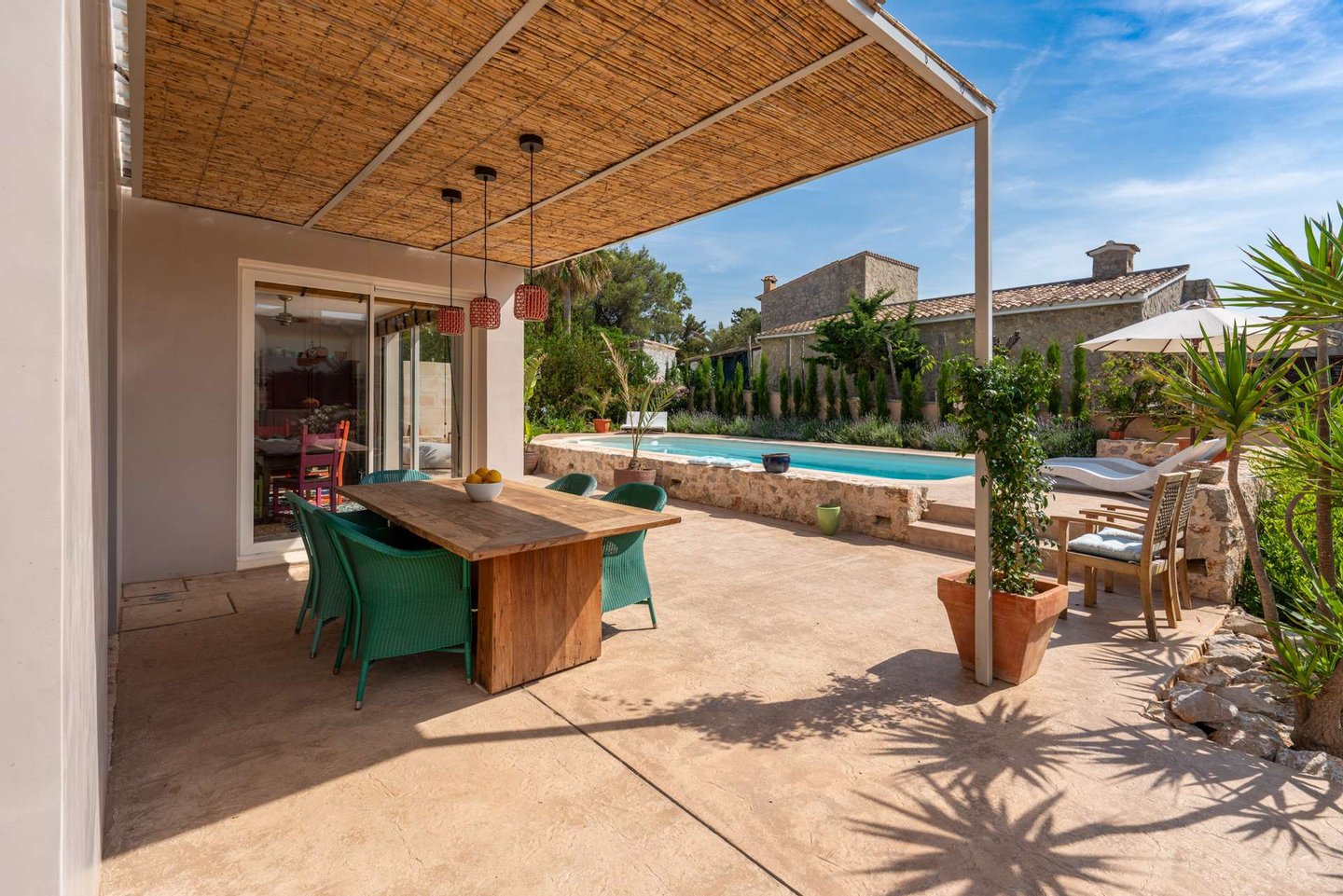 Der Außenbereich ist großzügig angelegt und bietet mehrere Terrassen sowie ruhige Plätze im Garten. Mittelpunkt ist der große Salzwasserpool, umgeben von mediterraner Bepflanzung und sonnigen Terrassenflächen.