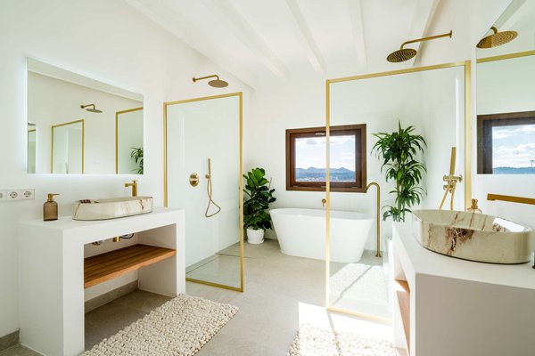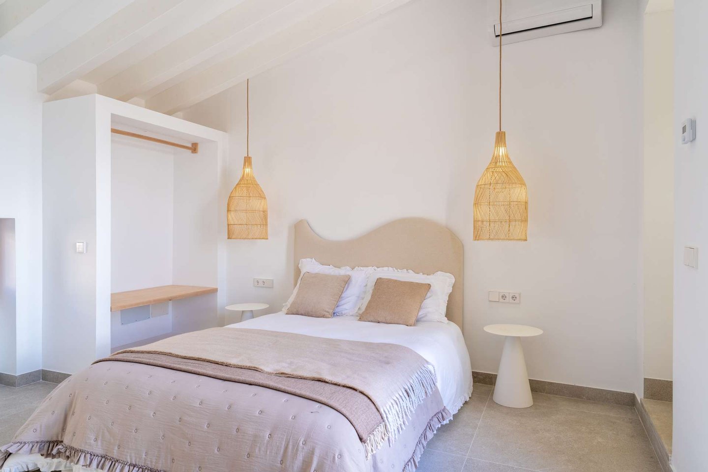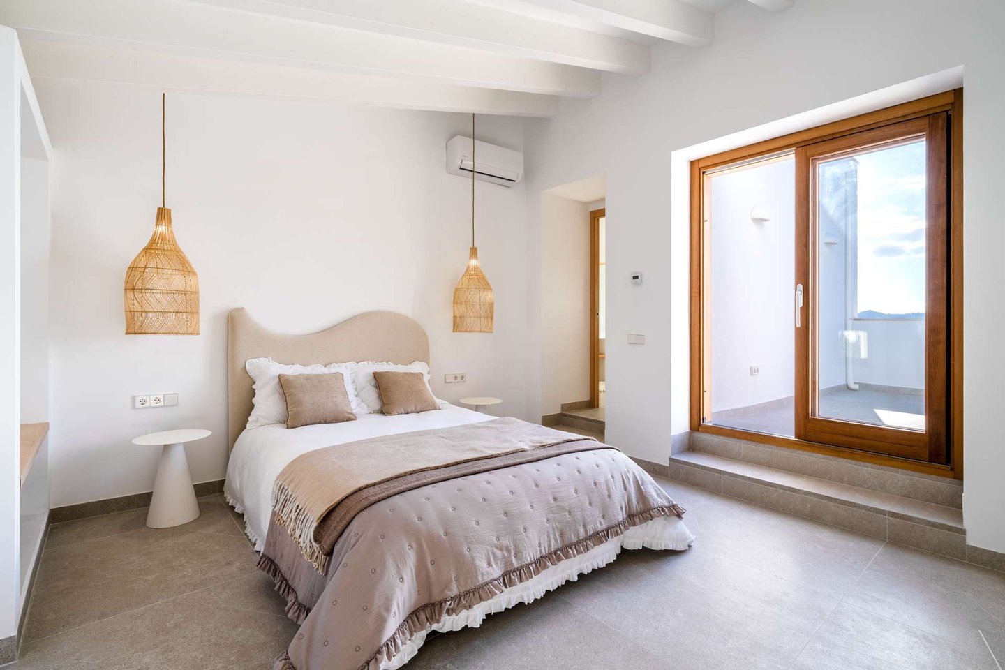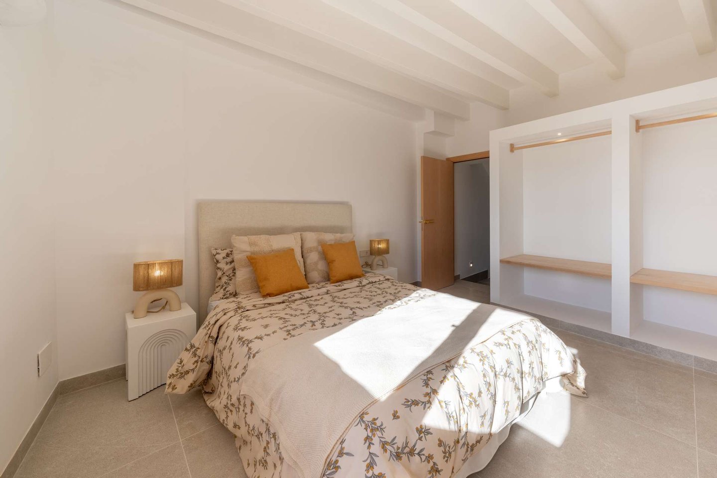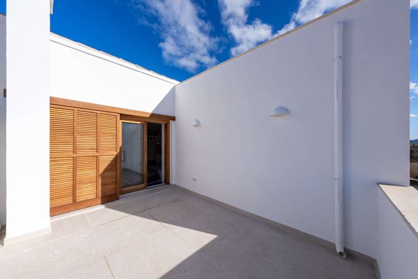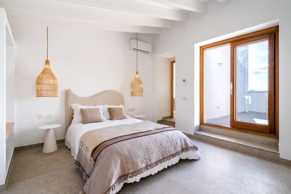 Auf der ersten Etage befinden sich zwei geschmackvoll gestaltete Schlafzimmer, jeweils mit Bad en Suite. Der oberste Bereich ist dem großzügigen Master-Schlafzimmer vorbehalten: ein privater Rückzugsort mit Zugang zur Dachterrasse und einem außergewöhnlich schönen Badezimmer mit Blick über Artà. Alle Schlafzimmer sind mit Einbauschränken ausgestattet.