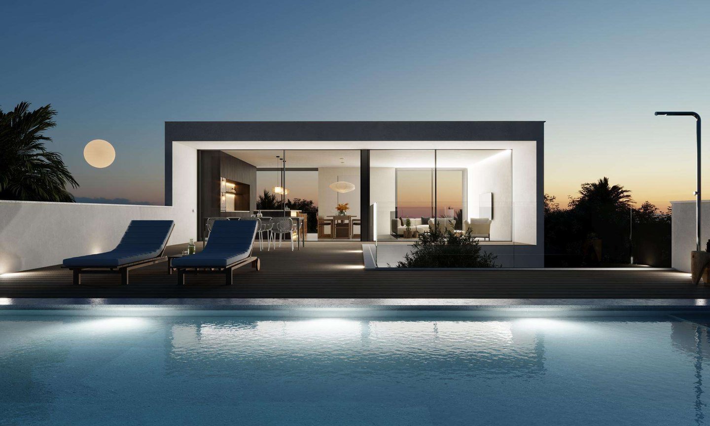 Technisch überzeugt die Villa mit Luft-Wärmepumpe, Fußbodenheizung, Klimaanlage, Solaranlage für Warmwasser, Aluminiumfenstern mit Doppelverglasung, einbruchhemmenden Türen sowie Smart-Home-Vorbereitung für Licht- und Temperatursteuerung. LED-beleuchtete Einbauschränke unterstreichen den hochwertigen Standard.