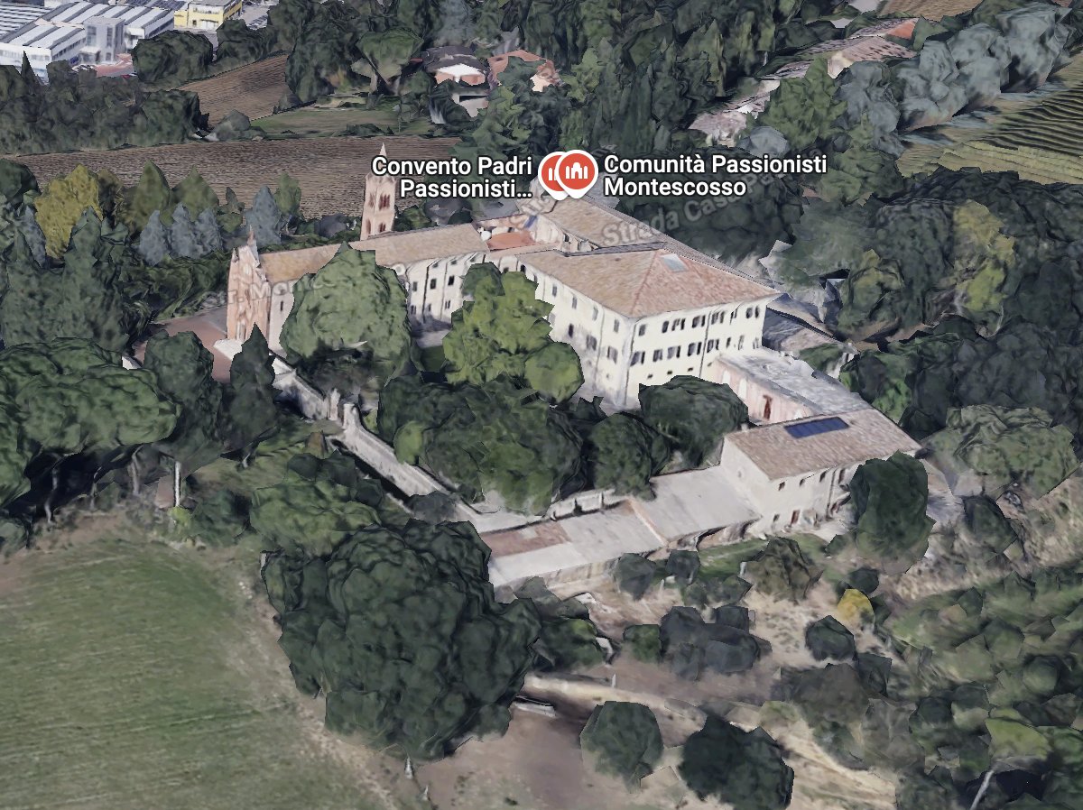 Das Kloster Montescosso ist eine Schenkung von zwei Adligen: den Grafen Riccio Ricci und Virginia Macchi von Rieti. Die Schenkung erfolgte durch den Grafen nach dem Tode seiner Frau, in ihrem Gedenken und durch ihr Testament. Im Jahr 1895 schrieb der Graf Passionisten, und ein Pater verließ das Heiligtum der Madonna della Stella (PG), um in der Kapelle zu amtieren. Im Juli 1898 gingen weitere Ordensleute (zwei Priester und zwei Brüder) dorthin. Zu Beginn mangelte es nicht an Schwierigkeiten im Zusammenhang mit dem erzwungenen Zusammenleben der Ordensgemeinschaft mit der Familie des Grafen Ricci. In der Zwischenzeit wurde im August 1898 das Apostolische Reskript zur kanonischen Eröffnung der Exerzitien erlassen, die nach dem heiligen Josef benannt wurden. Nach dem Tod des Grafen Ricci im November 1917 stand die Villa vollständig den Passionisten zur Verfügung. Es wurden verschiedene Anpassungen vorgenommen, obwohl die Villa nicht die architektonischen Merkmale eines Klosters aufwies. In der Zwischenzeit wurde an eine Kirche gedacht und sie nach einem Entwurf des Ingenieurs Belletti aus Cesena errichtet, wobei die Kosten von dem Passionisten Pater Luigi Besi getragen wurden, der das Notwendige aus dem Familienerbe schöpfte.