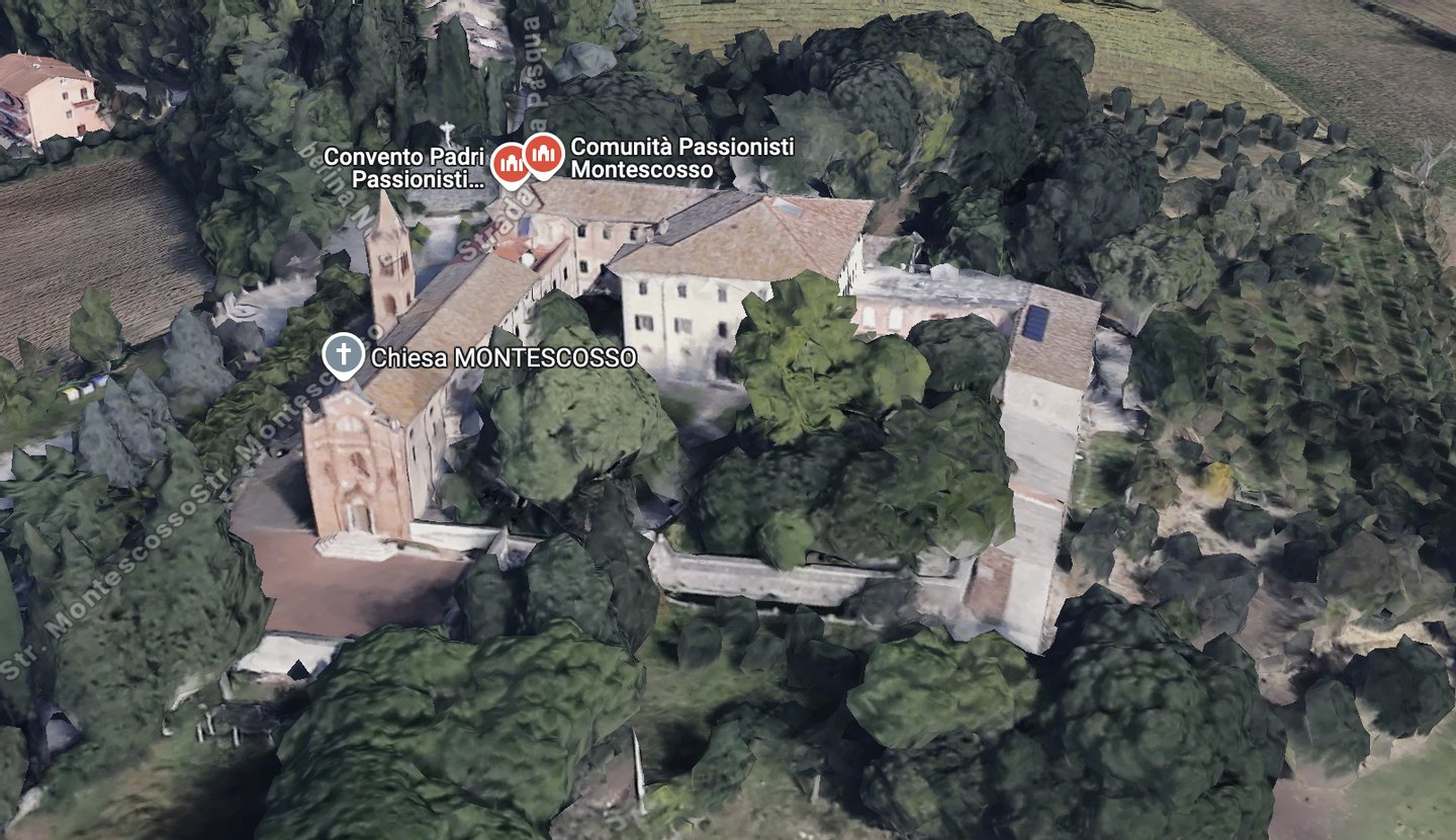 Das Kloster Montescosso ist eine Schenkung von zwei Adligen: den Grafen Riccio Ricci und Virginia Macchi von Rieti. Die Schenkung erfolgte durch den Grafen nach dem Tode seiner Frau, in ihrem Gedenken und durch ihr Testament. Im Jahr 1895 schrieb der Graf Passionisten, und ein Pater verließ das Heiligtum der Madonna della Stella (PG), um in der Kapelle zu amtieren. Im Juli 1898 gingen weitere Ordensleute (zwei Priester und zwei Brüder) dorthin. Zu Beginn mangelte es nicht an Schwierigkeiten im Zusammenhang mit dem erzwungenen Zusammenleben der Ordensgemeinschaft mit der Familie des Grafen Ricci. In der Zwischenzeit wurde im August 1898 das Apostolische Reskript zur kanonischen Eröffnung der Exerzitien erlassen, die nach dem heiligen Josef benannt wurden. Nach dem Tod des Grafen Ricci im November 1917 stand die Villa vollständig den Passionisten zur Verfügung. Es wurden verschiedene Anpassungen vorgenommen, obwohl die Villa nicht die architektonischen Merkmale eines Klosters aufwies. In der Zwischenzeit wurde an eine Kirche gedacht und sie nach einem Entwurf des Ingenieurs Belletti aus Cesena errichtet, wobei die Kosten von dem Passionisten Pater Luigi Besi getragen wurden, der das Notwendige aus dem Familienerbe schöpfte.