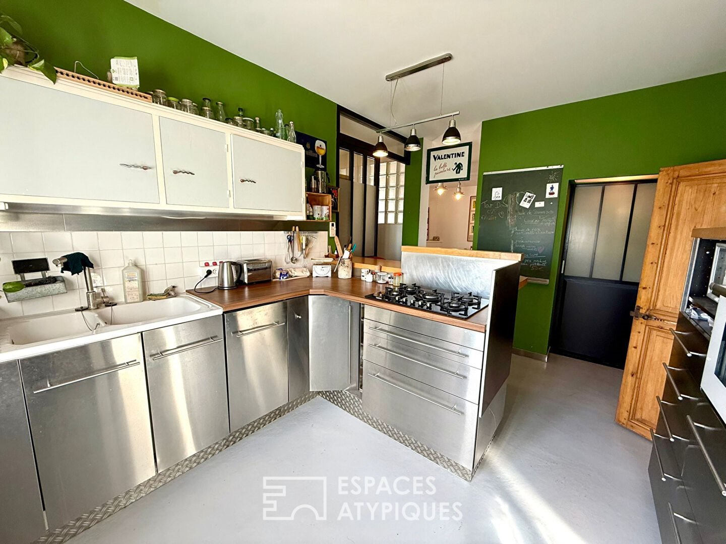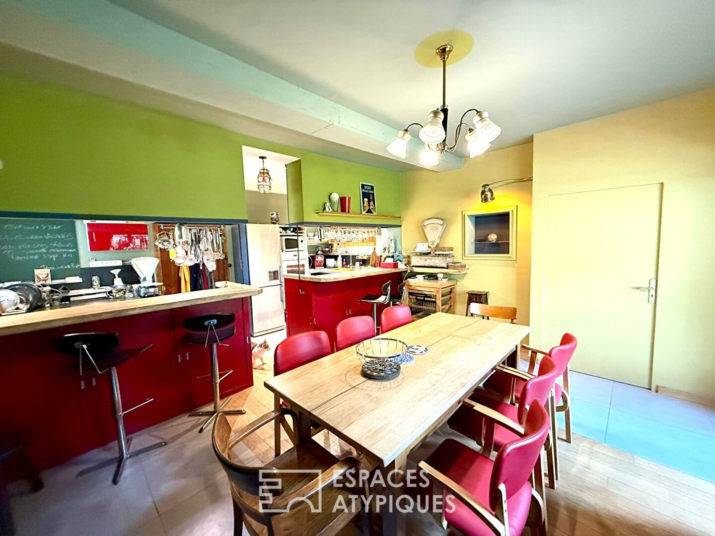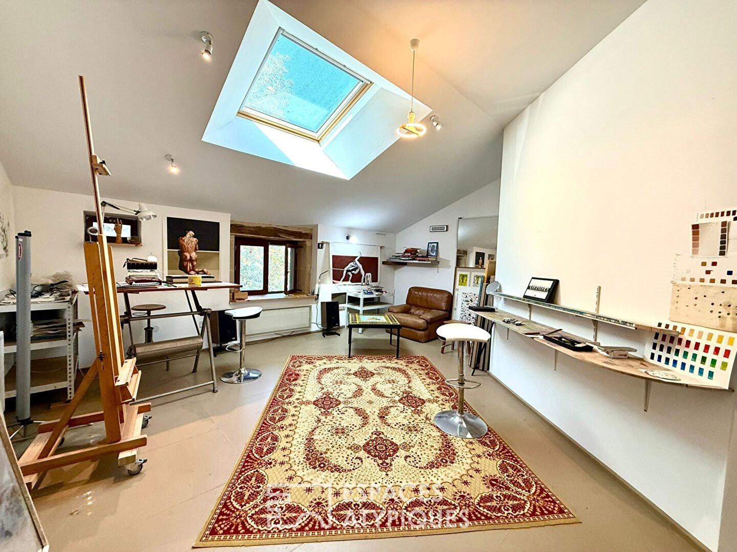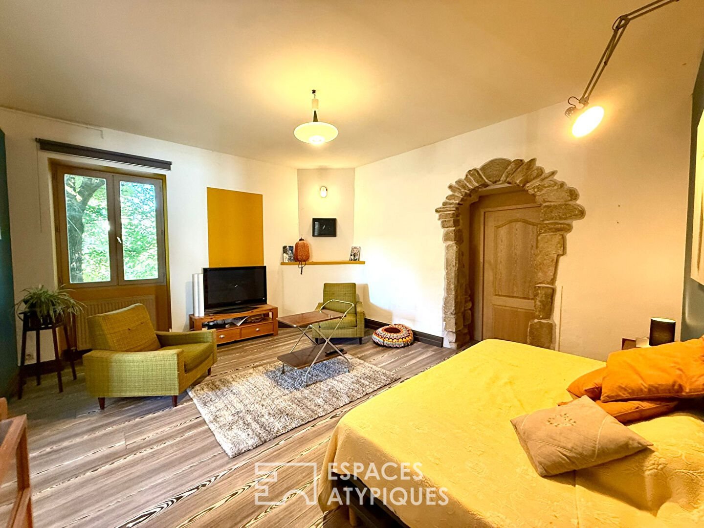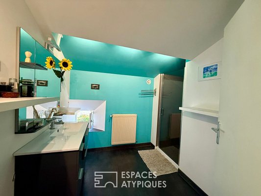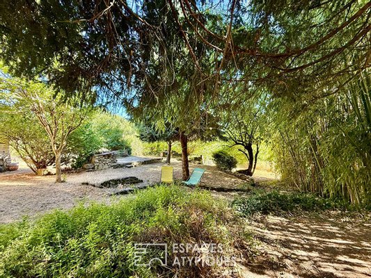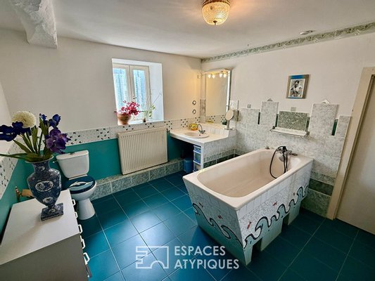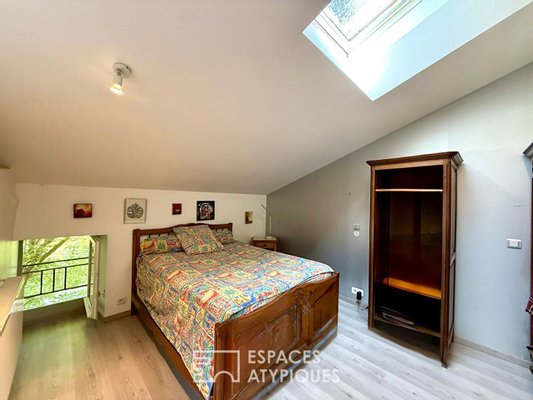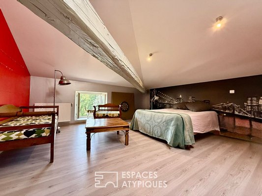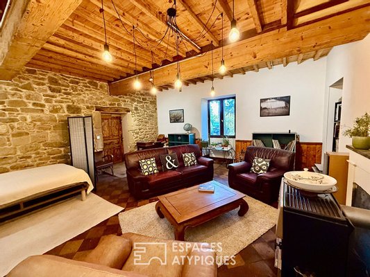 Das Innere erstreckt sich über drei Ebenen und feiert Fläche und Authentizität. Im Erdgeschoss öffnen sich gemütliche Wohnräume, darunter eine offene Küche mit Terrasse und ein Wohnzimmer, das durch einen Holzofen erwärmt wird, ergänzt durch ein erstes Schlafzimmer oder Büro. Das erste Obergeschoss, das bei Bedarf mit eigenem Eingang unabhängig werden kann, beherbergt eine zweite voll ausgestattete Küche sowie ein Wohnzimmer und zwei gemütliche Schlafzimmer. Die letzte Ebene präsentiert schließlich eine komplette Suite und ein großzügiges Malatelier, lichtdurchflutet – ideal, um der Kreativität freien Lauf zu lassen. Die edlen Materialien, zwischen sichtbaren Steinen und Gewölben, schaffen eine ruhige und elegante Atmosphäre zur Besinnung.