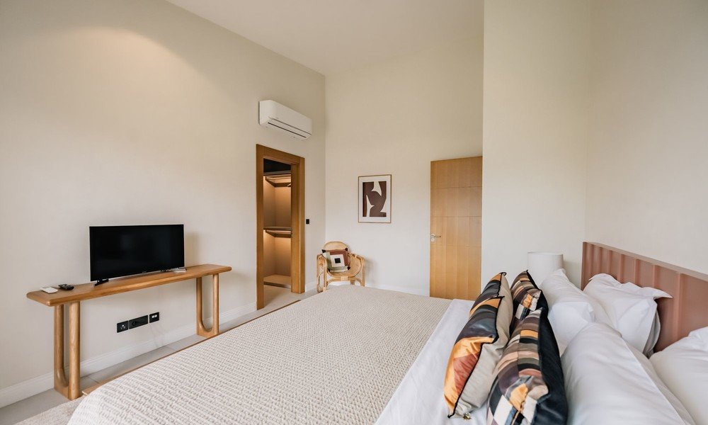 The villa comprises four spacious bedrooms, each with its own beautifully appointed ensuite bathroom, ensuring privacy and comfort for family and guests alike. Designed with both sophistication and functionality in mind, the residence also features a dedicated office space, ideal for remote work or quiet reflection.