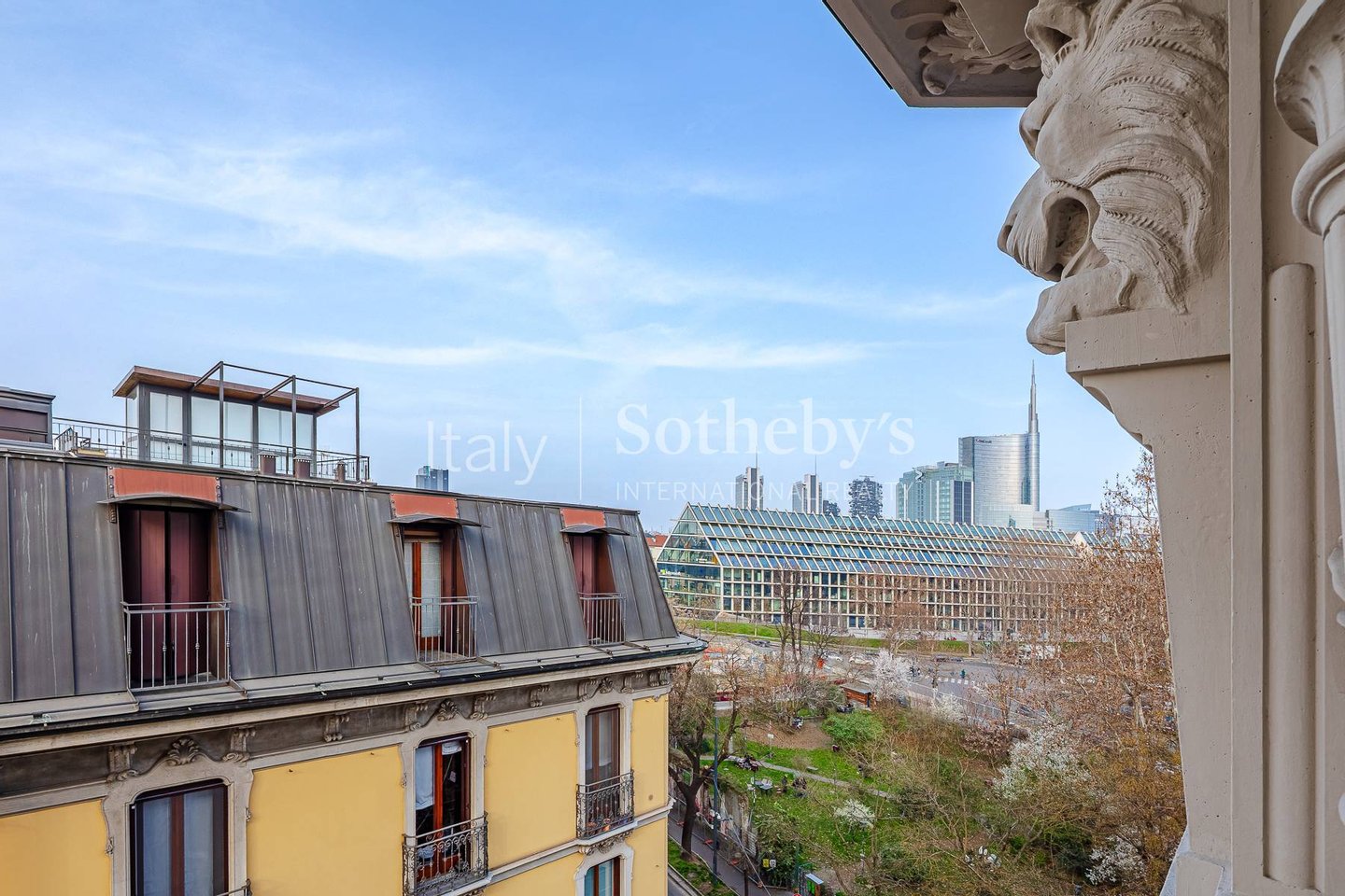 Recently renovated, the apartment enjoys breathtaking views over the city, embracing iconic landmarks such as the Bosco Verticale, Piazza Gae Aulenti, CityLife and the entire Milan skyline. Arranged over two levels, the property extends across more than 300 sqm. On the fifth floor, a welcoming entrance leads to a bright living area distinguished by four large windows that beautifully frame the panoramic views. The space also features an elegant bar corner and a study, as well as a master bedroom with an en suite bathroom and a spacious walk-in wardrobe. Two additional bedrooms, each with a private bathroom. Another guest bathroom complete this level. Ascending to the sixth floor, the large custom-designed open kitchen opens onto a service area with staff bedroom and separate service entrance. Two terraces provide exceptional outdoor spaces with remarkable views, complemented by an additional bathroom.