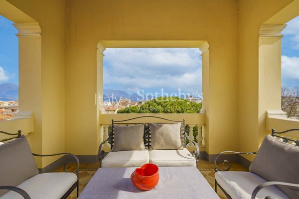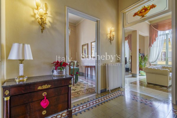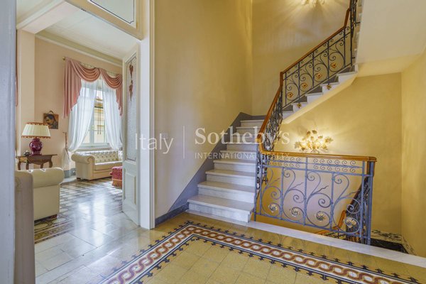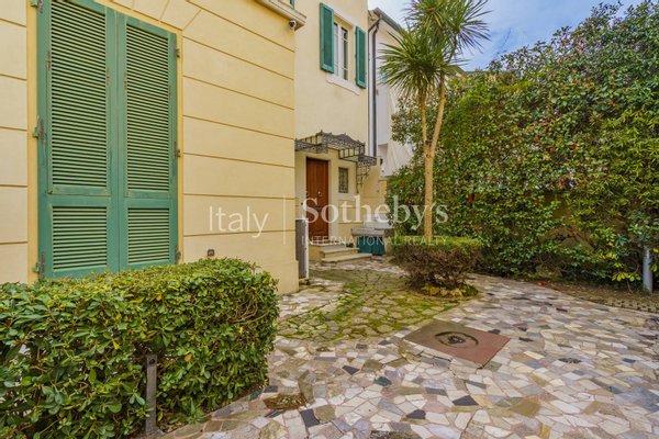 Thanks to its corner position, the villa benefits from two independent entrances, allowing flexible use of the property. The ground floor, measuring approximately 144 sqm, consists of four spacious rooms and a bathroom, featuring mosaic floors, high ceilings, and decorative plasterwork. From the main entrance, there is access to the marble staircase with its original balustrade, the elevator, and the basement. The main floor retains its original stucco work and mosaics and is arranged with a double living room with a Carrara marble fireplace and balcony, a dining room with balcony, a spacious kitchen with access to the terrace, a laundry room, and a bathroom. The second floor hosts the sleeping area with three double bedrooms, a study, two bathrooms with shower or whirlpool bathtub, a storage room, and custom-built wardrobes.