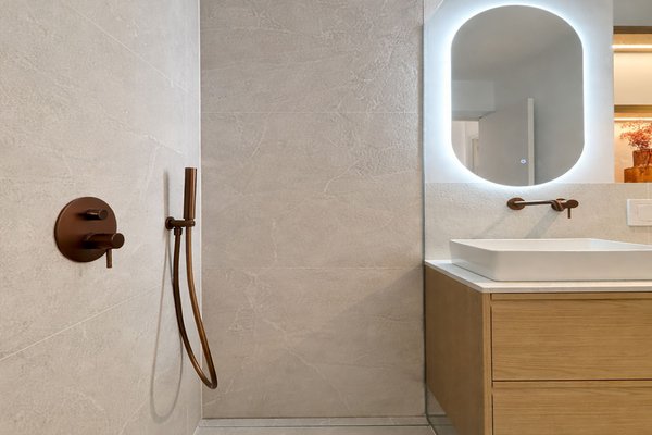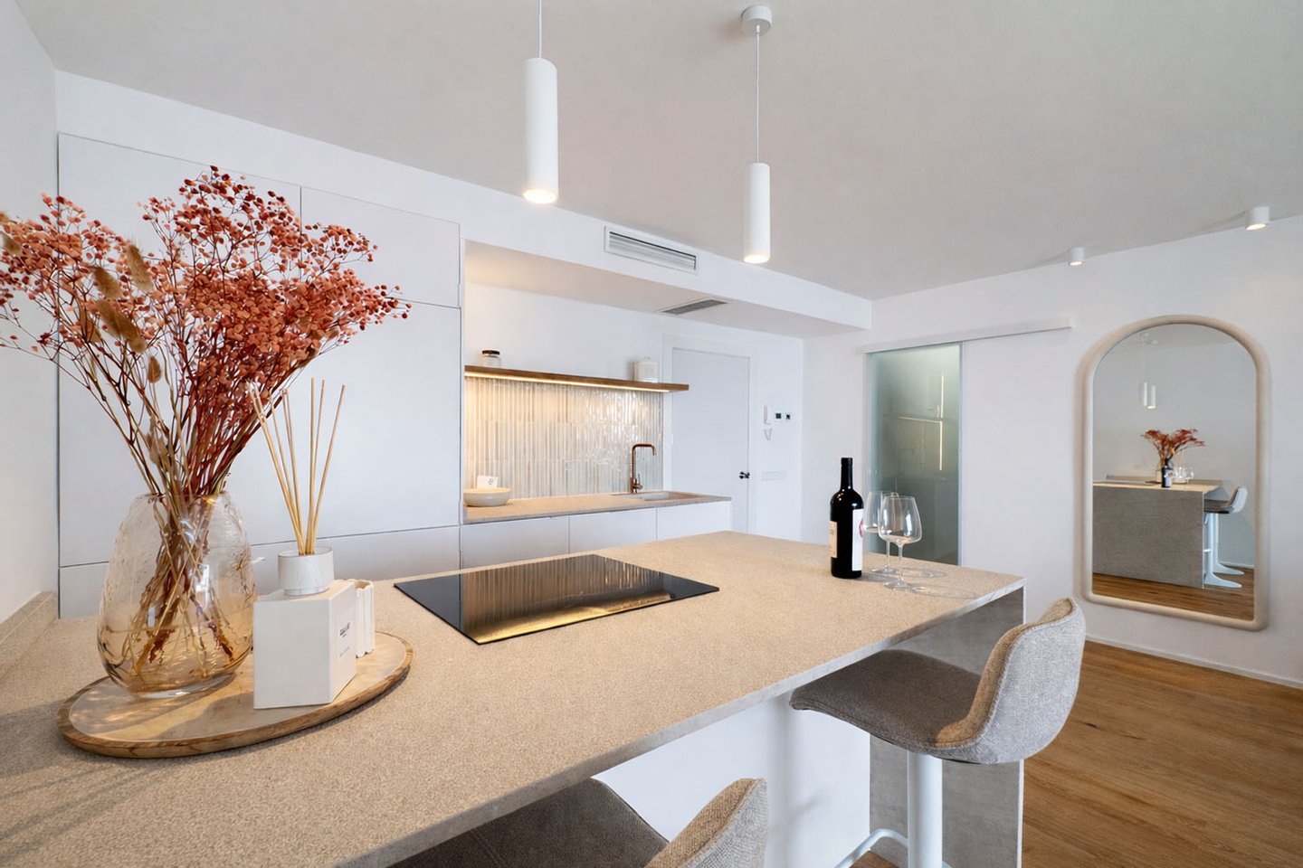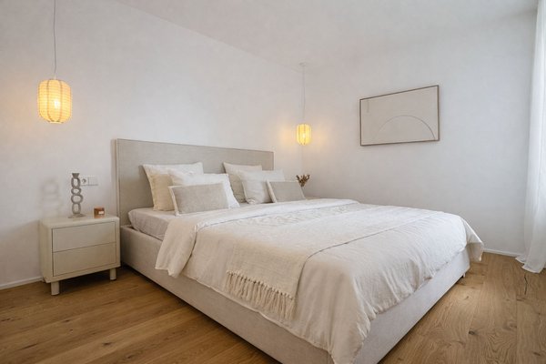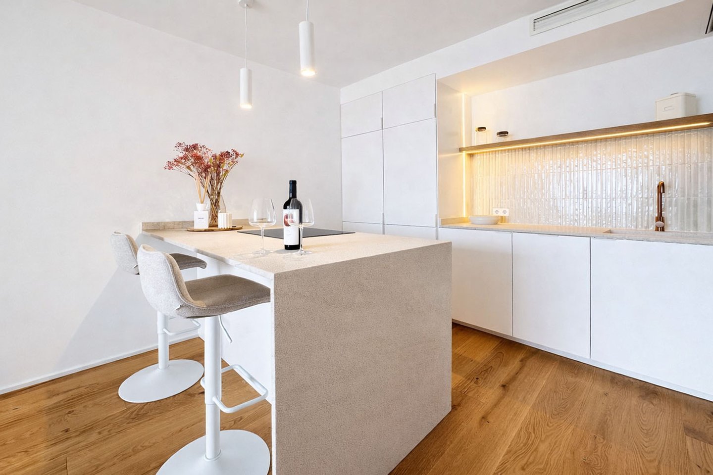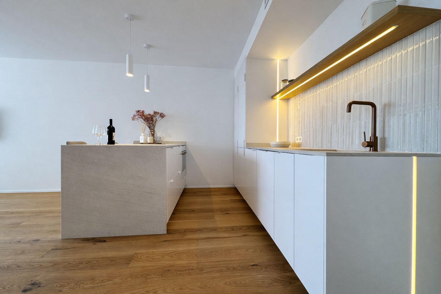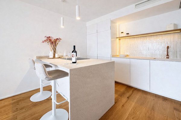 Der Wohnbereich öffnet sich mit schöner Aussicht zum Hafen und geht fließend in die offene Designküche über. Diese ist mit einer zentralen Kochinsel ausgestattet und verbindet Funktionalität mit Ästhetik. Eine hochwertige Gris-Zarci-Arbeitsplatte sowie eine durchdachte Lichtführung unterstreichen den modernen Charakter der Wohnung. Auch das großzügige Schlafzimmer fügt sich harmonisch in das stilvolle Gesamtbild ein und verfügt über einen integrierten Schreib- beziehungsweise Schminktisch mit indirekter Beleuchtung im eleganten Hotelstil.