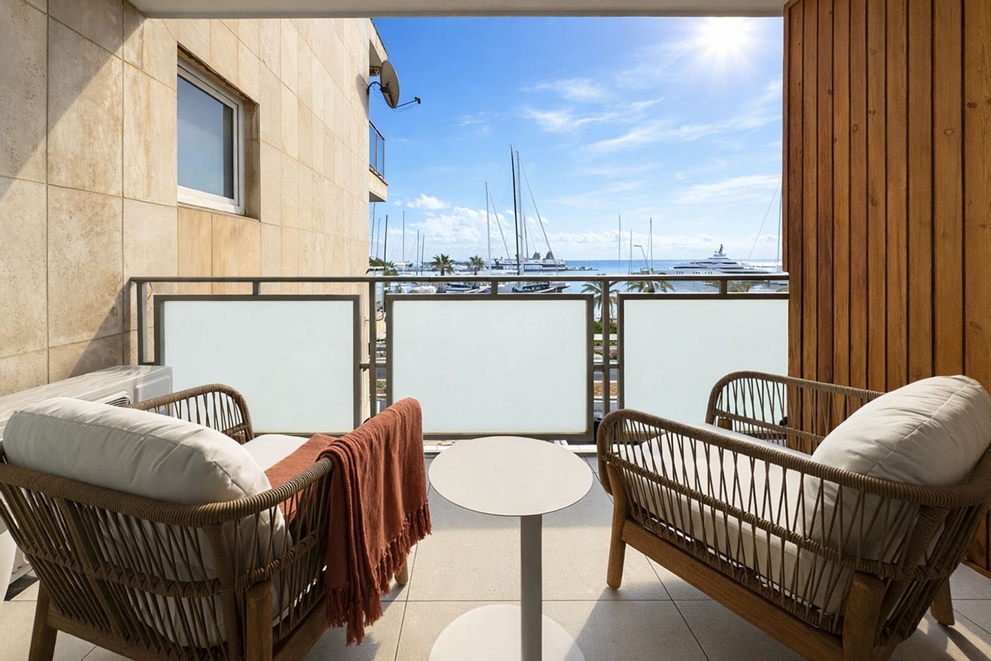 Ein besonderes Highlight ist die gemütliche, überdachte Terrasse mit Meer- und Panoramablick – ein idealer Ort, um den Blick auf das Wasser und die vorbeiziehenden Yachten zu genießen.