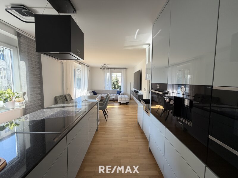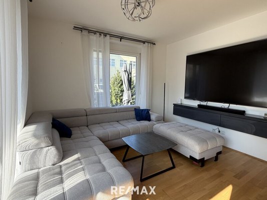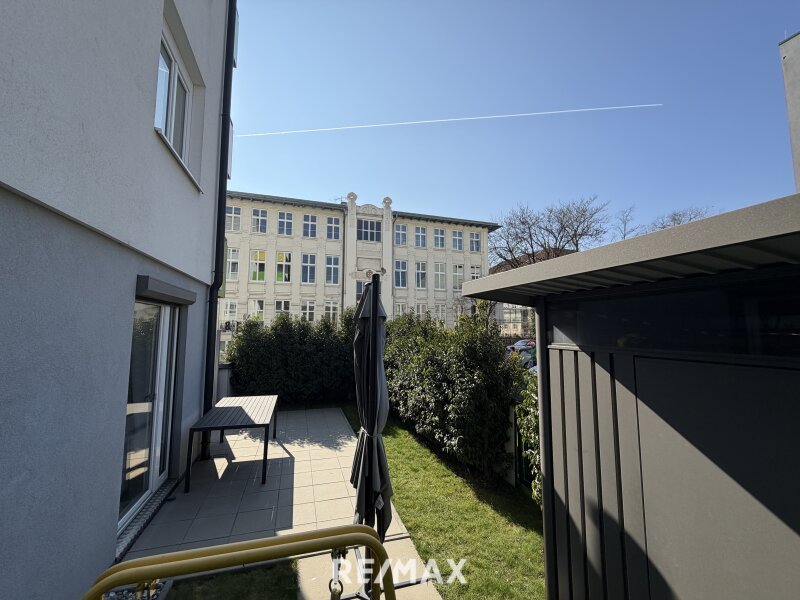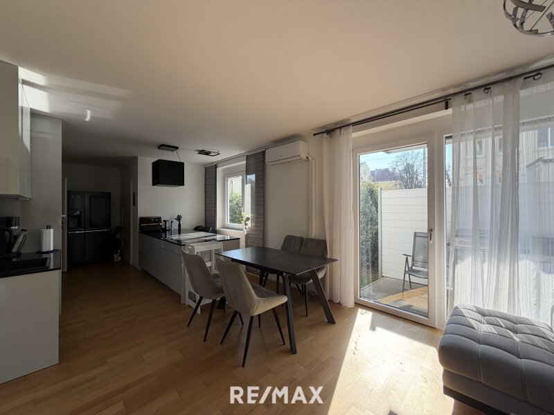 Der helle Wohn- und Essbereich bildet das Herzstück der Wohnung. Große Fenster sorgen für viel Tageslicht und schaffen eine angenehme Wohnatmosphäre. Von hier aus haben Sie direkten Zugang zur Terrasse und zum rund 44 m² großen Garten, der zum Entspannen, Sonnen oder gemütlichen Beisammensein im Freien einlädt. Eine Gartenhütte bietet Platz für Gartengeräte.