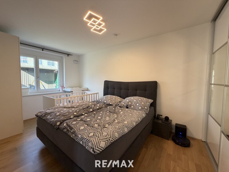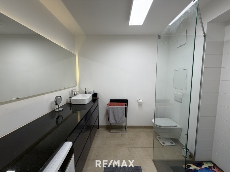 Das Schlafzimmer bietet das ausreichend Platz für ein großes Bett und Kleiderschrank. Das Badezimmer ist modern ausgestattet und verfügt über eine ebenerdige Dusche und ein WC.