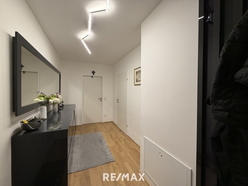 Beim Betreten der Wohnung gelangen Sie in einen einladenden Vorraum, der einen angenehmen ersten Eindruck vermittelt und ausreichend Platz für Garderobe bietet. Von hier aus erreichen Sie den Wohnbereich mit einer voll ausgestattete Küche, die funktional gestaltet ist und genügend Platz zum Kochen und Arbeiten bietet.