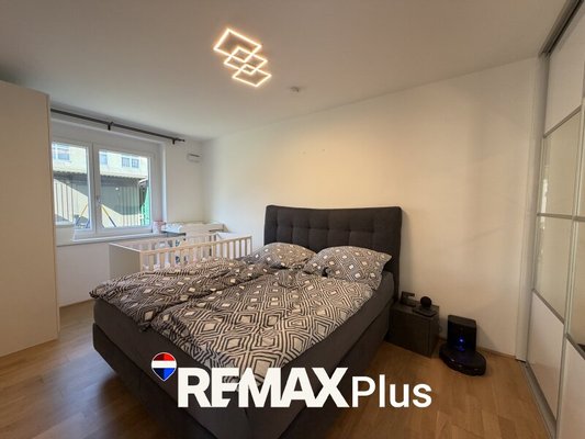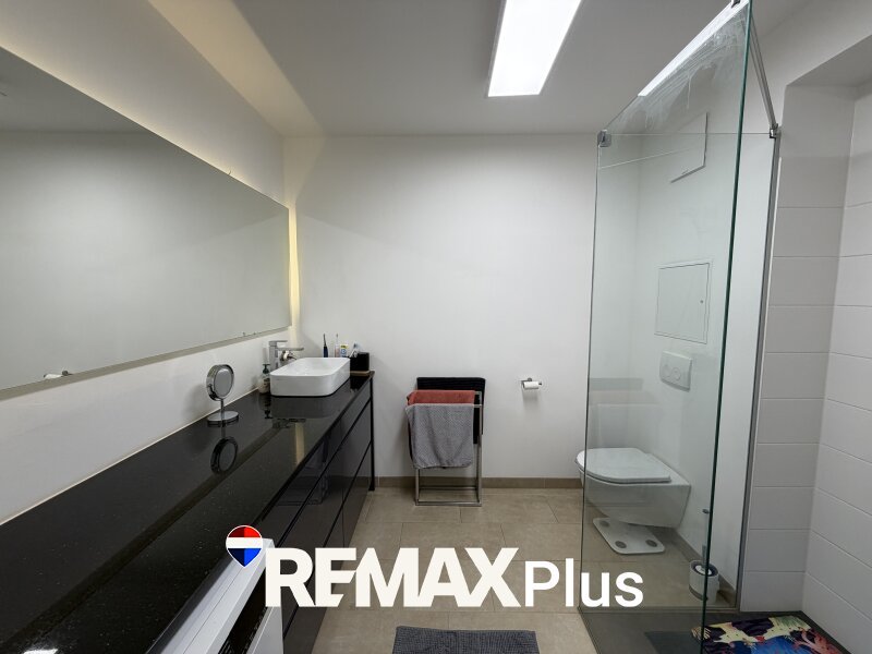 Das Schlafzimmer bietet das ausreichend Platz für ein großes Bett und Kleiderschrank. Das Badezimmer ist modern ausgestattet und verfügt über eine ebenerdige Dusche und ein WC.