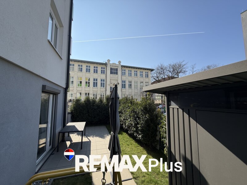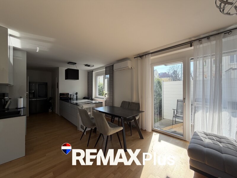 Der helle Wohn- und Essbereich bildet das Herzstück der Wohnung. Große Fenster sorgen für viel Tageslicht und schaffen eine angenehme Wohnatmosphäre. Von hier aus haben Sie direkten Zugang zur Terrasse und zum rund 44 m² großen Garten, der zum Entspannen, Sonnen oder gemütlichen Beisammensein im Freien einlädt. Eine Gartenhütte bietet Platz für Gartengeräte.
