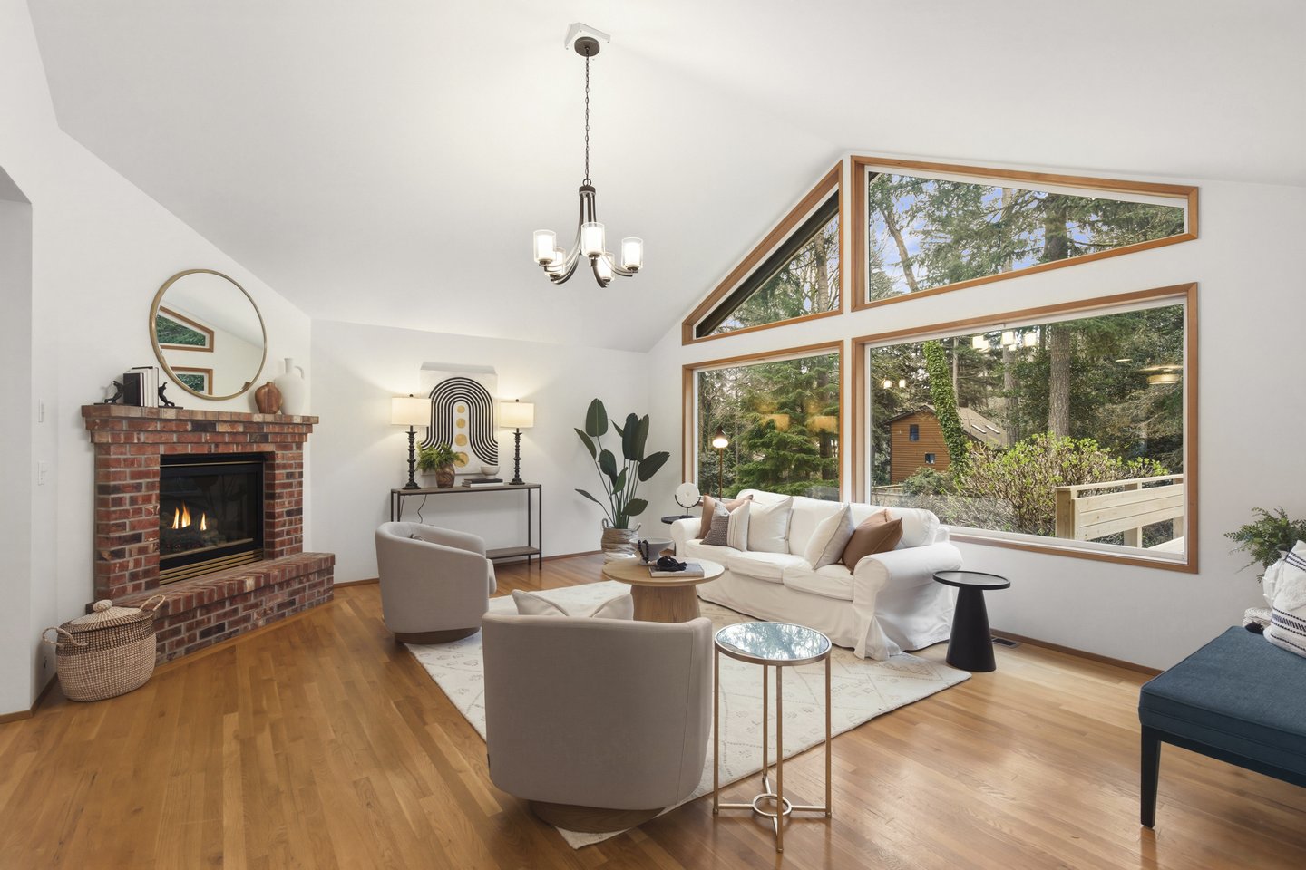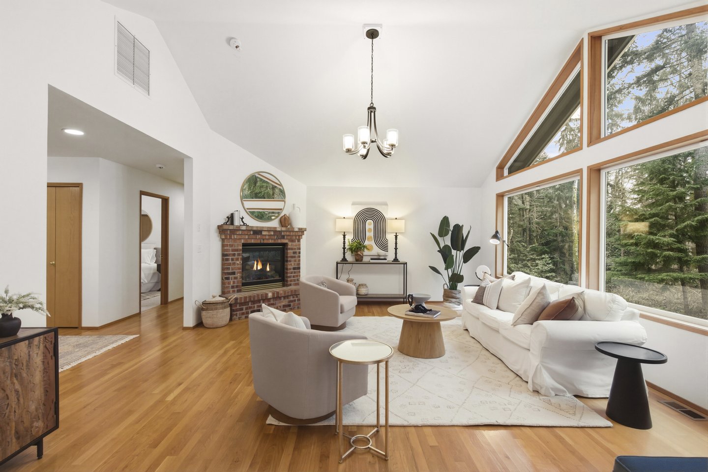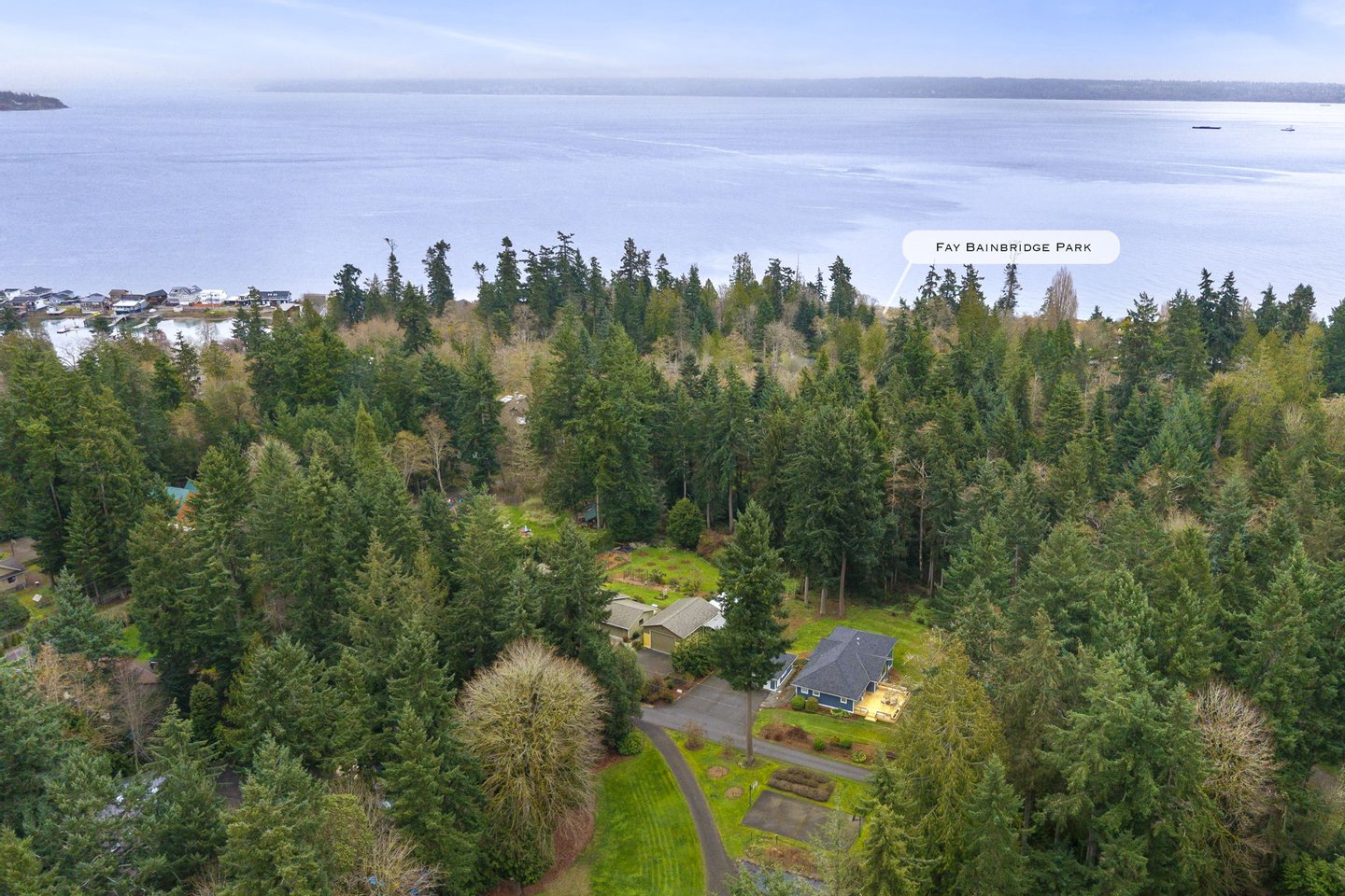 Located in the peaceful Sunrise neighborhood across from Fay Bainbridge Park, this inviting single-level home offers comfortable island living on a private 1.23-acre property. Vaulted ceilings, hardwood floors, and a warm brick fireplace create a