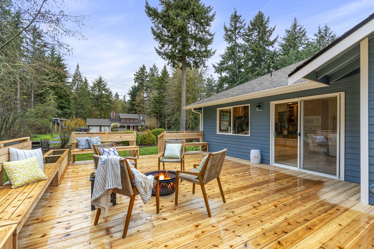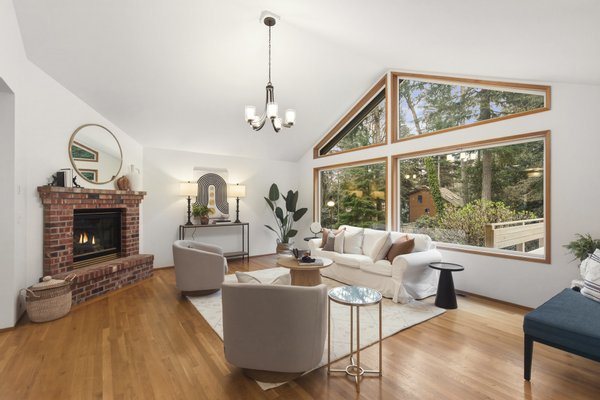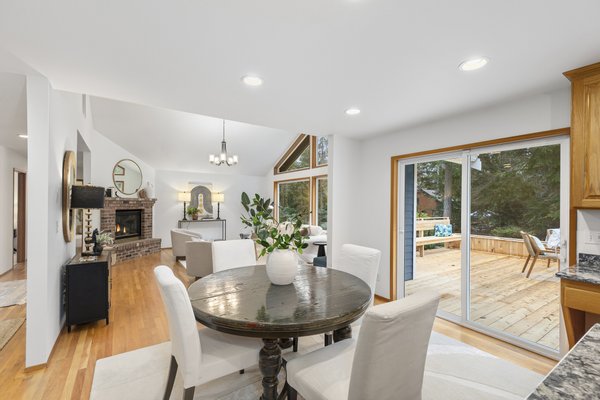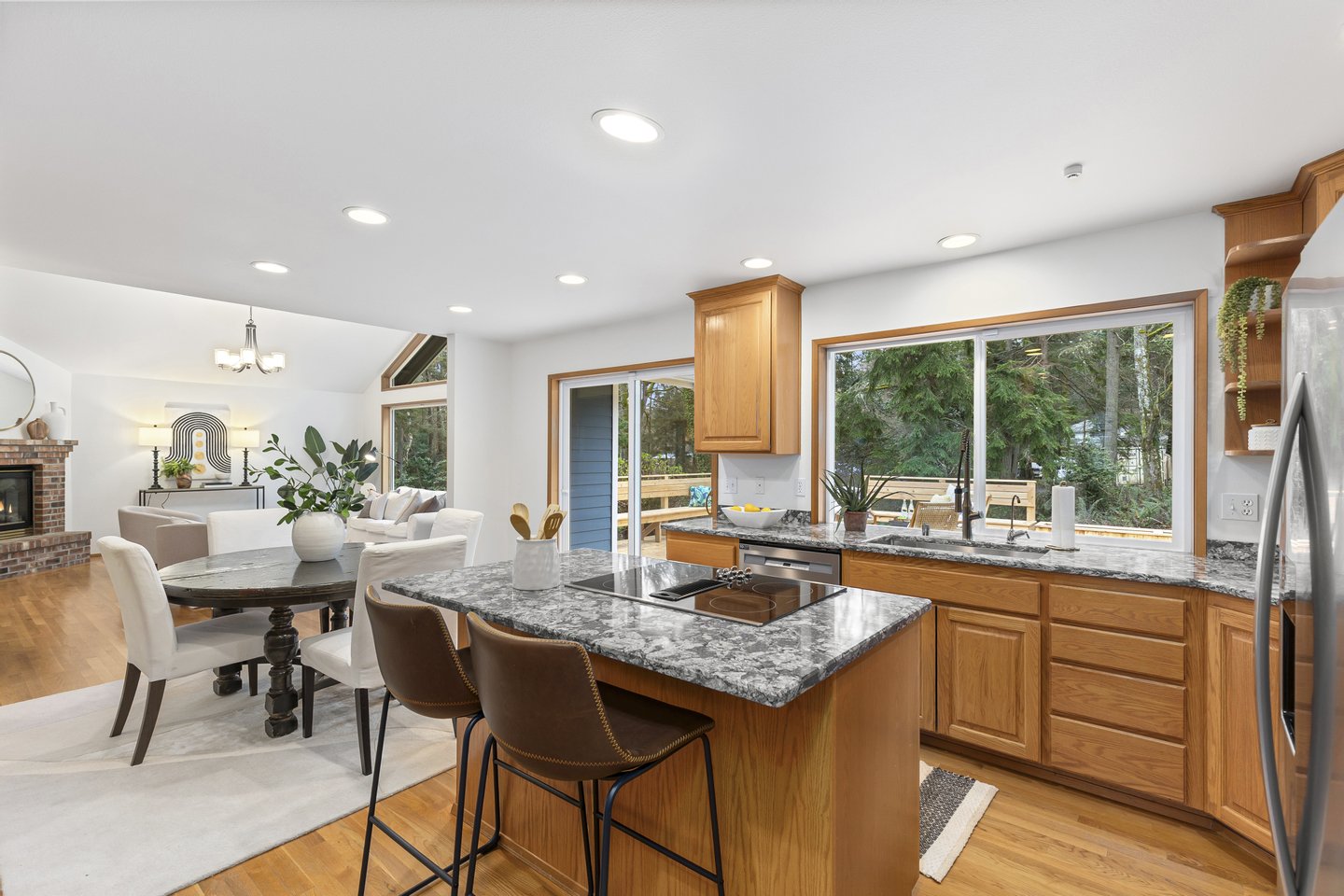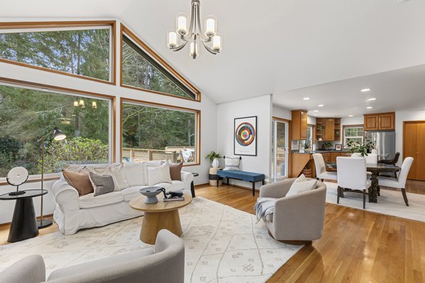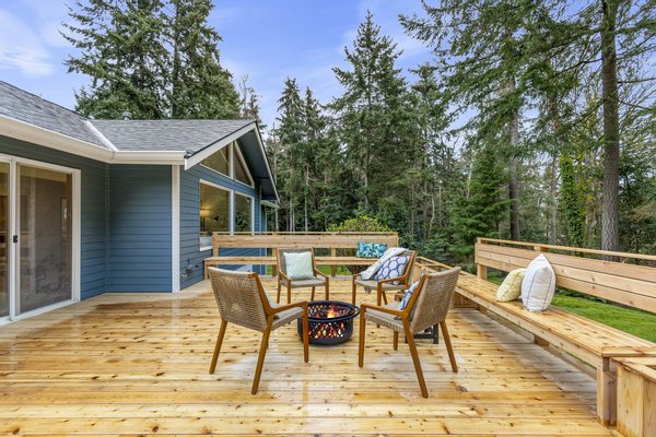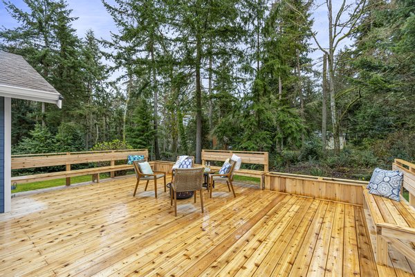 Located in the peaceful Sunrise neighborhood across from Fay Bainbridge Park, this inviting single-level home offers comfortable island living on a private 1.23-acre property. Vaulted ceilings, hardwood floors, and a warm brick fireplace create a bright and welcoming main living space, while large windows bring in natural light throughout the home. The open kitchen features granite countertops and an island cooktop, flowing easily into the dining and living areas. Just outside, a spacious deck with built-in seating and planters provides the perfect setting for outdoor entertaining or quiet mornings surrounded by nature.