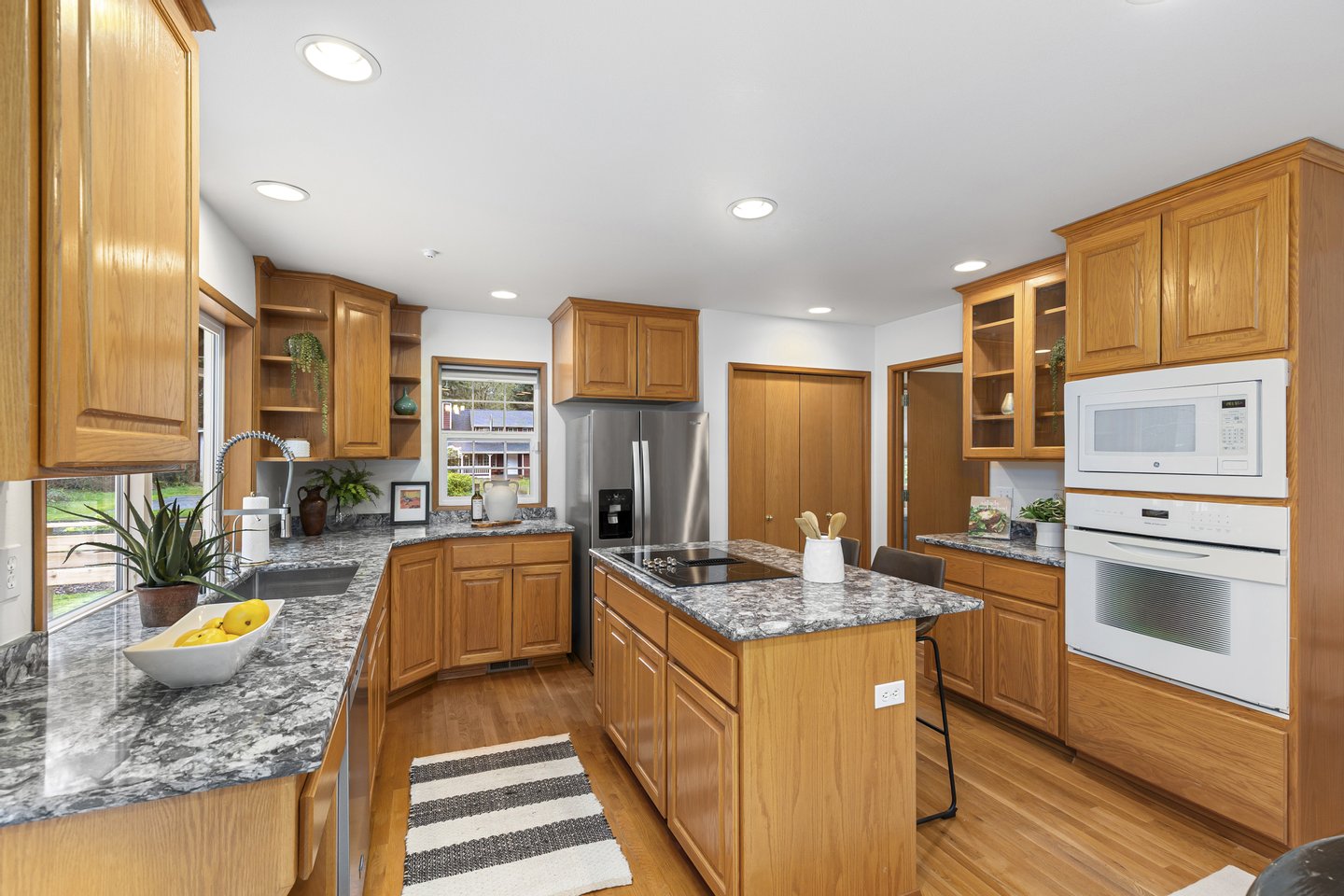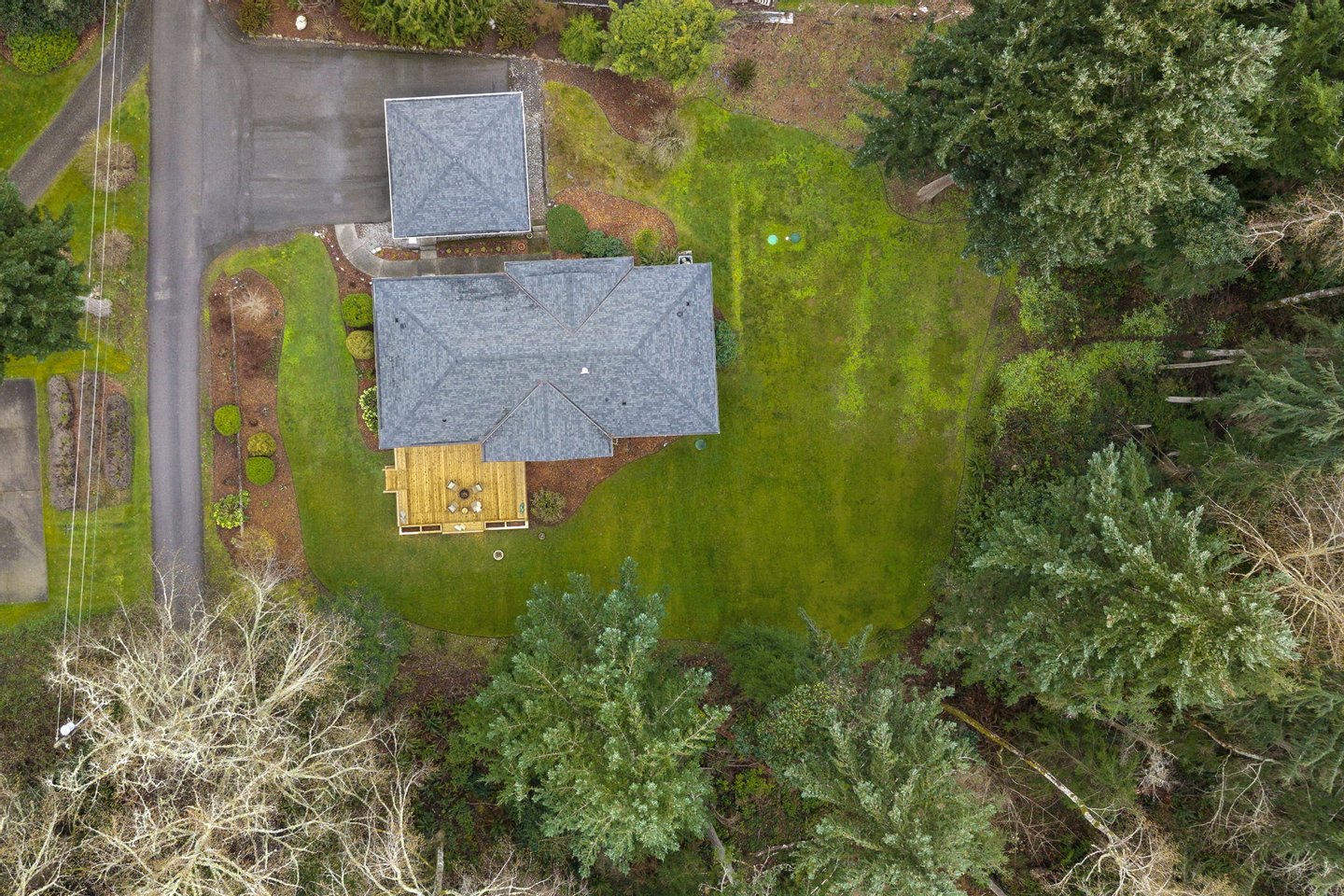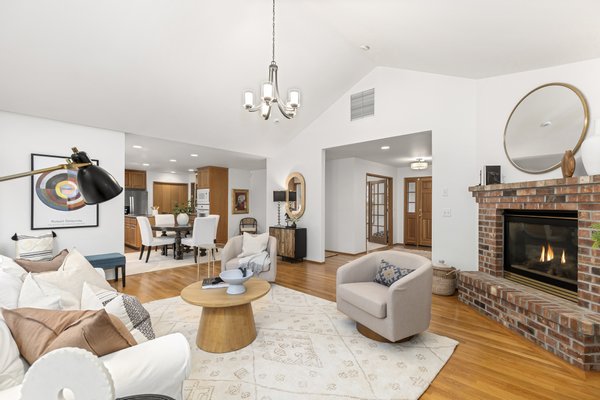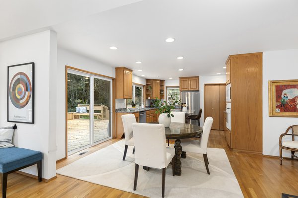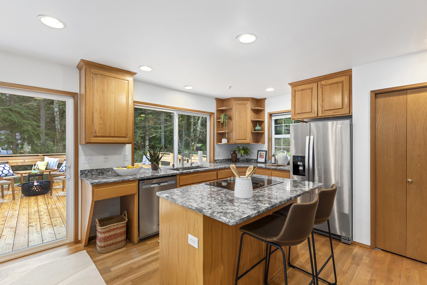 Located in the peaceful Sunrise neighborhood across from Fay Bainbridge Park, this inviting single-level home offers comfortable island living on a private 1.23-acre property. Vaulted ceilings, hardwood floors, and a warm brick fireplace create a bright and welcoming main living space, while large windows bring in natural light throughout the home. The open kitchen features granite countertops and an island cooktop, flowing easily into the dining and living areas. Just outside, a spacious deck with built-in seating and planters provides the perfect setting for outdoor entertaining or quiet mornings surrounded by nature.