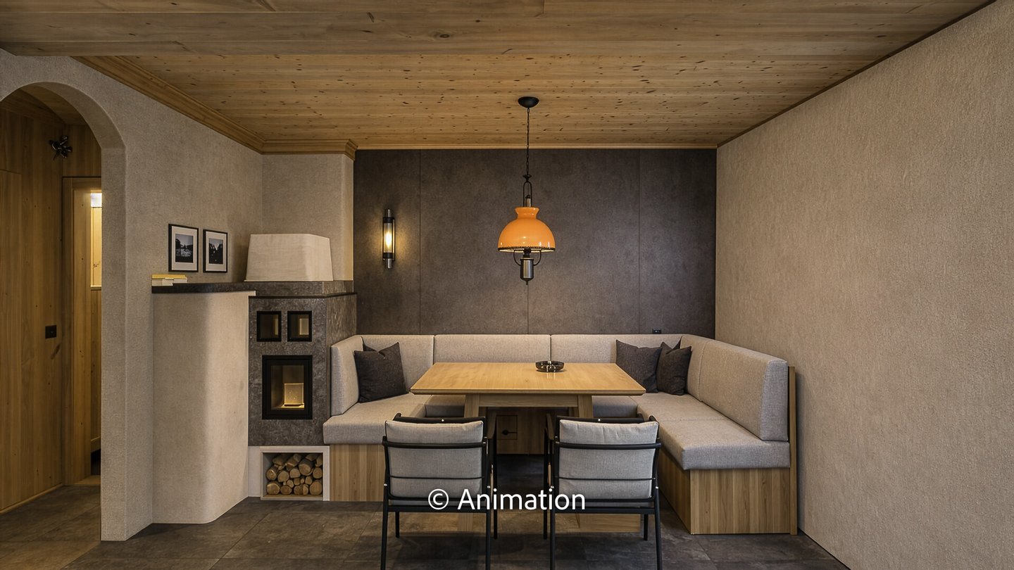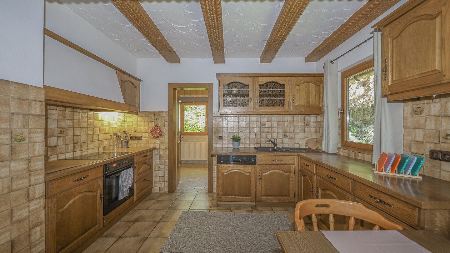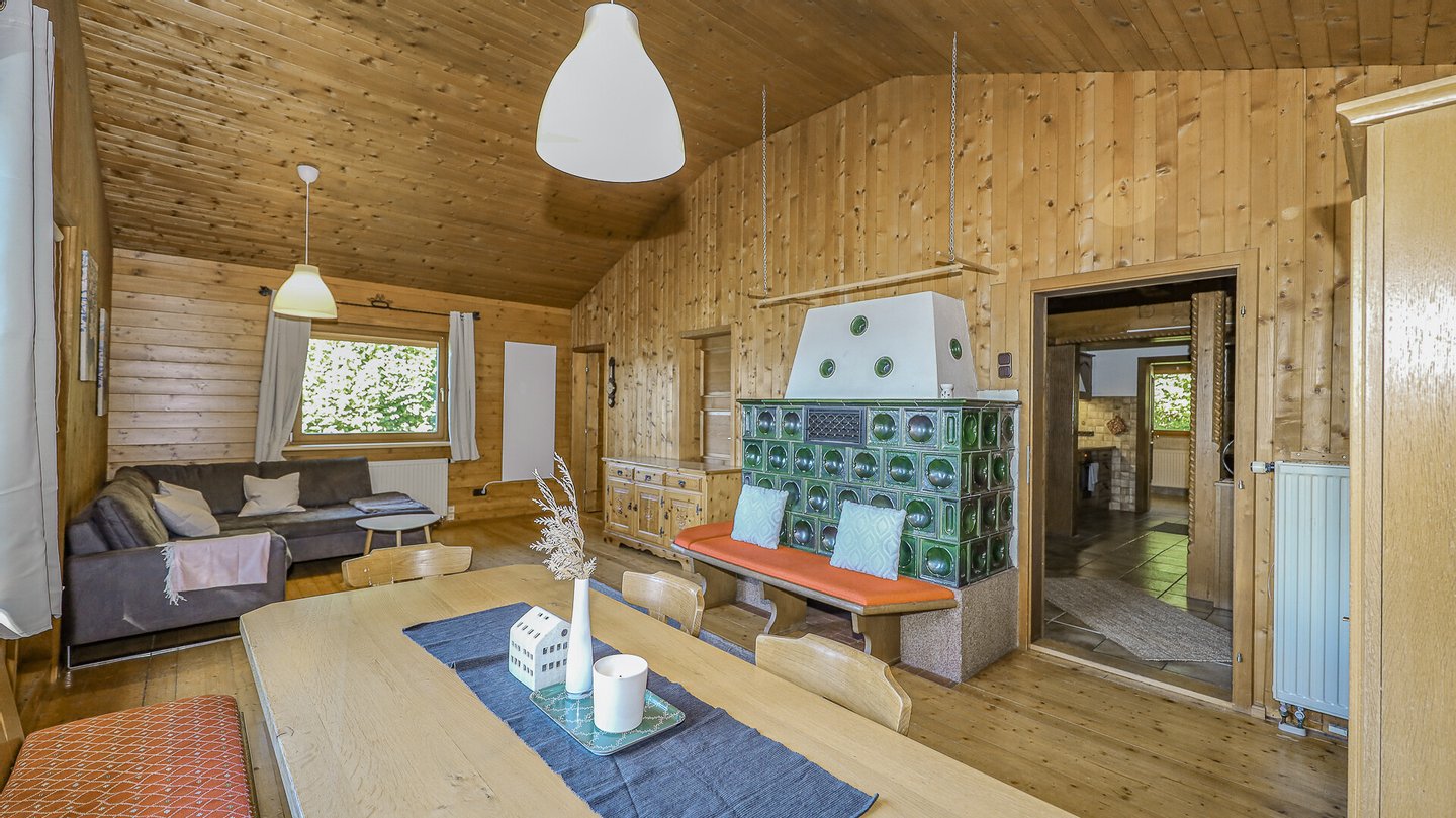 Insgesamt besteht das Haupthaus aus zwei Geschossen. Im Obergeschoss befindet sich der Wohnbereich mit Kachelofen und sehr großer Sonnenterrasse, die Küche, zwei Schlafzimmer und ein Badezimmer.