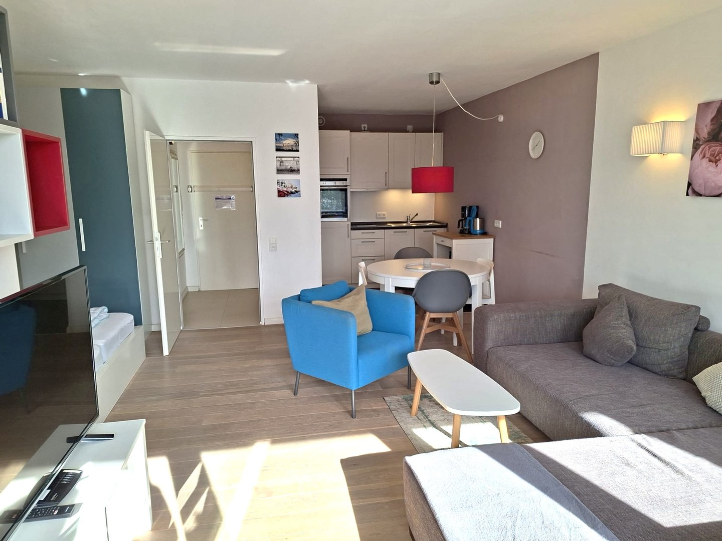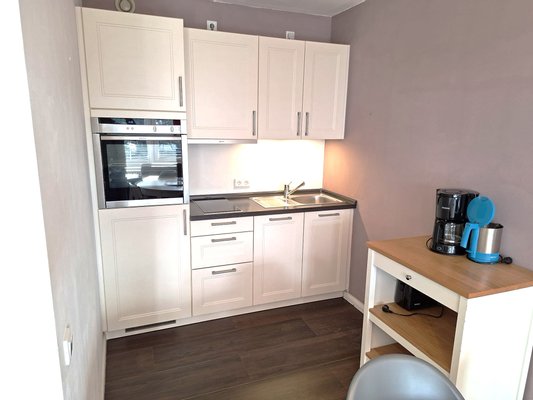 Zur Wohnung gehören die Eingangsdiele, das große Wohnzimmer mit großer Schlafnische, Essplatz und offener Küche, ein weiteres kleines Schlafzimmer sowie das Duschbad/WC.