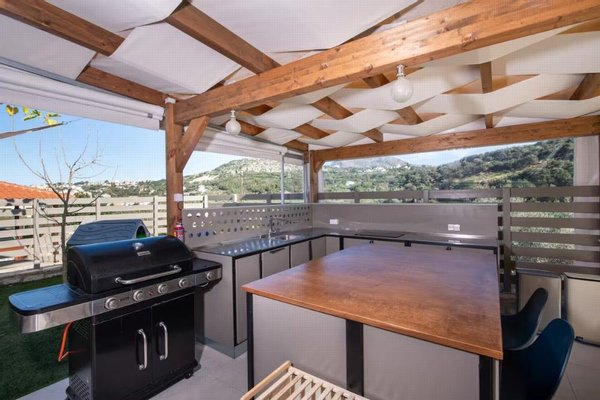 Ein besonderes Highlight des Anwesens ist der großzügige Außenbereich. Eine über 80 m² große Pergola dient als natürliche Erweiterung des Wohnraums und verfügt über eine voll ausgestattete Außenküche. Dieser Bereich wird im Sommer zu einem zusätzlichen Wohnzimmer, das Schatten und Luftzirkulation bietet. Im Winter lässt er sich an den Seiten schließen, sodass der Raum ganzjährig nutzbar ist. Der beheizte Swimmingpool ist von gepflegten Gärten und Terrassen umgeben, die zum Entspannen und Verweilen einladen.