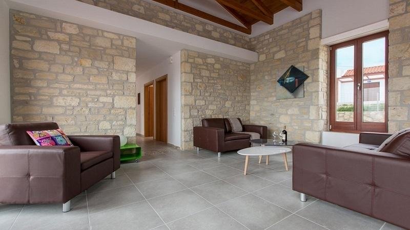 Die ebenerdige Villa vereint traditionellen Charme mit modernem Komfort. Der luftige, offene Wohnbereich besticht durch hohe Decken und sichtbare Holzbalken, die das Raumgefühl verstärken. Natursteinwände verleihen dem Raum Wärme und Authentizität, während große Glastüren viel Tageslicht hereinlassen und einen fließenden Übergang zum Außenbereich schaffen. Vom Wohnzimmer aus gelangt man direkt auf die Terrasse und zum Poolbereich und kann so das ganze Jahr über ein harmonisches Zusammenspiel von Innen- und Außenbereich genießen.