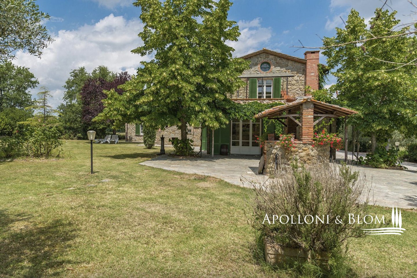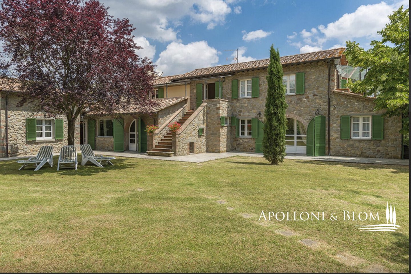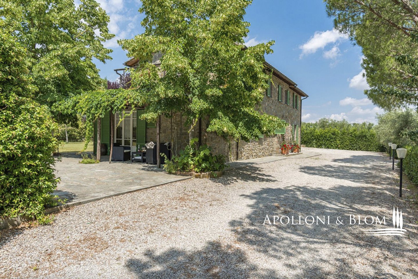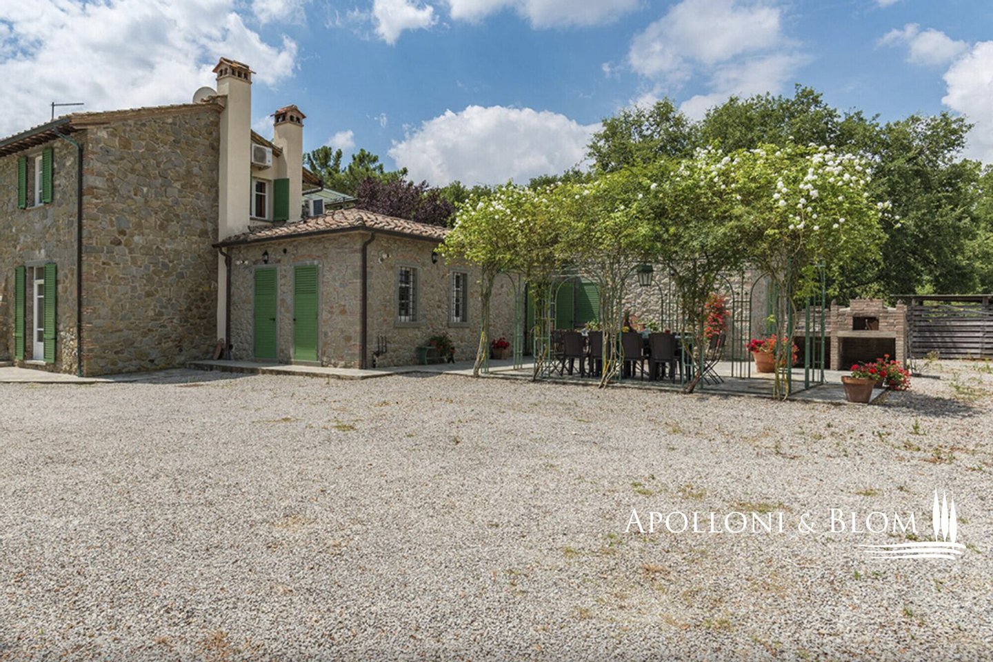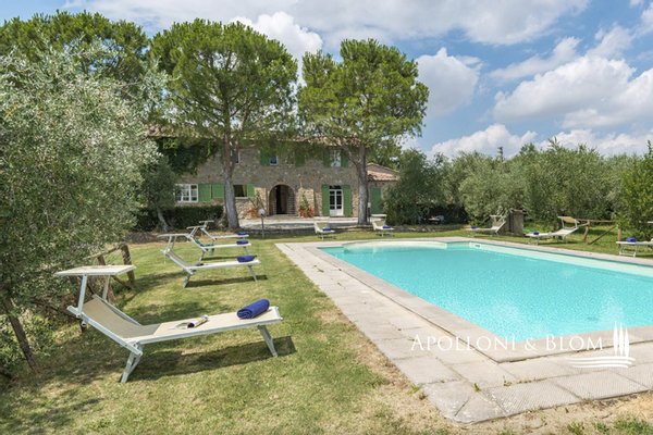 Perfekt restauriertes Bauernhaus aus Stein mit authentischem Charme, Klimaanlage, Schwimmbad, Olivenhain und geschützter Lage, zu verkaufen in Cortona. Strategisch gelegen, nur wenige Minuten von allen Dienstleistungen und dem historischen Zentrum von Cortona, ein Bauernhaus aus Stein aus dem frühen 19. Jahrhundert in einer reservierten Umgebung, umgeben von der Landschaft des Valdichiana. Jahrhundert, das im Jahr 2010 in eine elegante Landvilla umgewandelt wurde, verfügt über eine Fläche von 385 Quadratmetern, die sich auf zwei Hauptetagen und einen traditionellen Keller im Untergeschoss verteilen, und liegt auf einem privaten Grundstück von 9.600 Quadratmetern. Bei der Renovierung wurde die Authentizität des ursprünglichen Gebäudes mit seinen Steinfassaden, Terrakottaböden und freiliegenden Balken hervorgehoben, wobei die historischen Elemente bewahrt und moderne Annehmlichkeiten mit viel Feingefühl eingebaut wurden. Steinkamine und hohe Decken verleihen den Räumen Wärme und zeitlose ländliche Eleganz, während Fensterrahmen und Türen, die komplett durch Doppelverglasung ersetzt wurden, mit den traditionellen salbeigrünen Holzfensterläden der toskanischen Häuser harmonieren. Im Erdgeschoss befindet sich eine Eingangshalle, die zu einem Doppelwohnzimmer mit Steinkamin und einem Essbereich führt. Angrenzend befindet sich eine geräumige Küche im rustikalen Stil mit Kamin, die direkt mit dem Außenbereich mit Innenhof, Pavillon und Grill verbunden ist. Ein Service-Bad, Abstellräume und drei Doppelschlafzimmer, alle mit eigenem Bad, vervollständigen diese Ebene. Eine klassische Steintreppe führt in den ersten Stock, wo sich ein Hauptschlafzimmer mit eigenem Bad und Zugang zu einer privaten Terrasse mit Blick auf die Landschaft, zwei weitere Doppelschlafzimmer, eines mit Terrasse, ein Bad und ein Abstellraum befinden. Alle Räume sind klimatisiert. Im gepflegten Garten wechseln sich Rasenflächen, Blumenbeete, Pinien und hohe Bäume ab, die zu jeder Jahreszeit eine stimmungsvolle Kulisse bilden. In der Mitte befindet sich der Swimmingpool, der von einem eleganten Steinpflaster umrahmt ist, während sich jenseits des Gartens ein Olivenhain mit 100 Bäumen erstreckt, der der Anlage einen authentischen landwirtschaftlichen Charakter verleiht. Ein privater Brunnen speist die automatische Bewässerungsanlage. Heute wird das Anwesen von internationalen Reisenden gewählt, die einen raffinierten Rückzugsort für ihren Urlaub in der toskanischen Landschaft suchen, aber es eignet sich auch perfekt als eleganter privater Wohnsitz, der mit Familie und Freunden bewohnt werden kann.