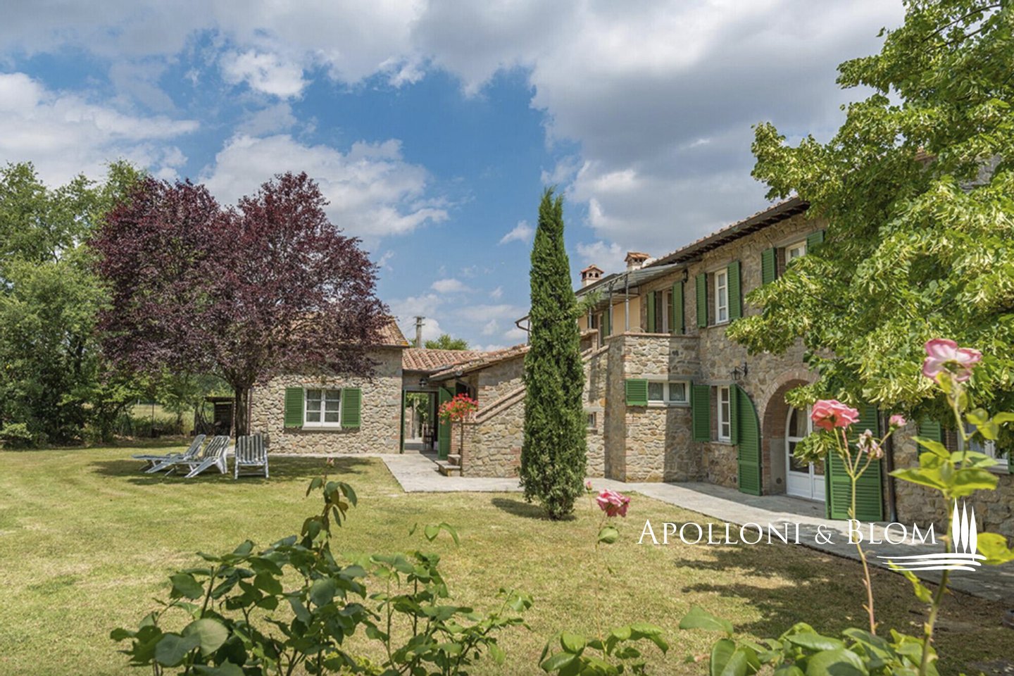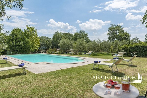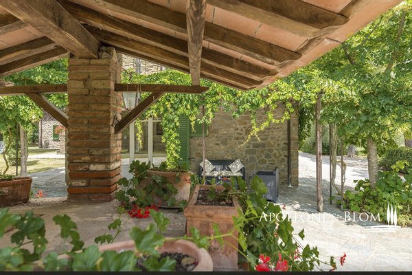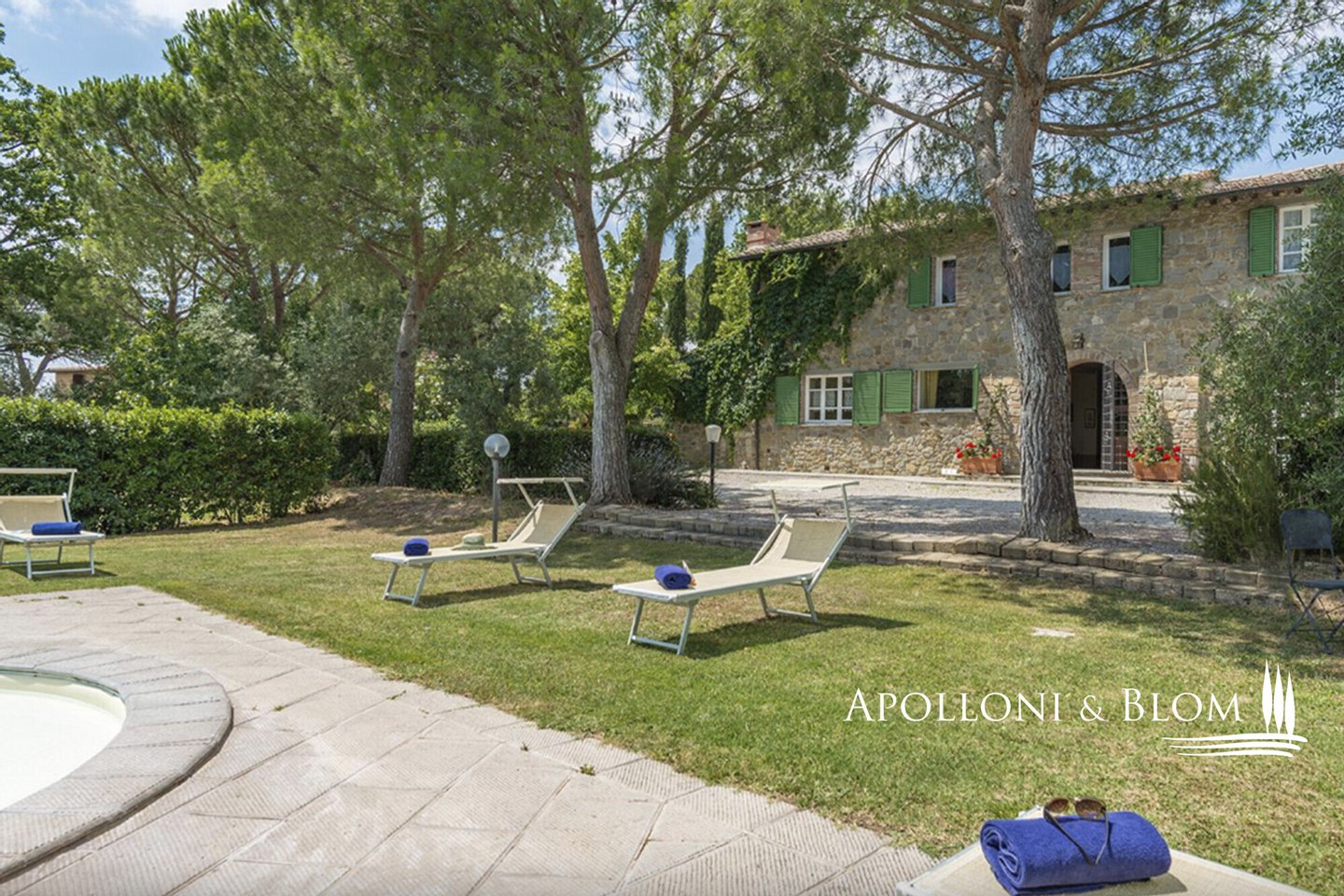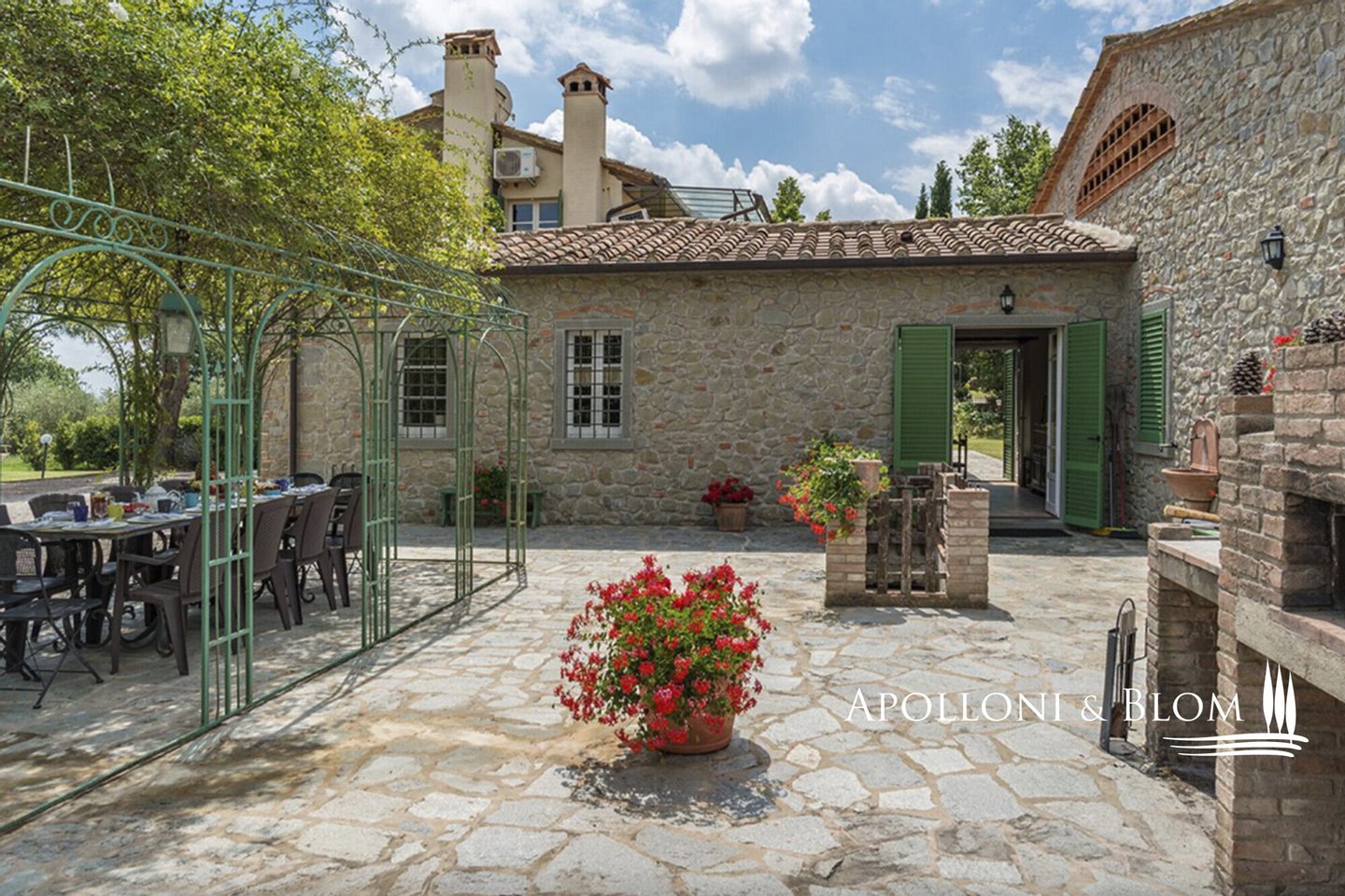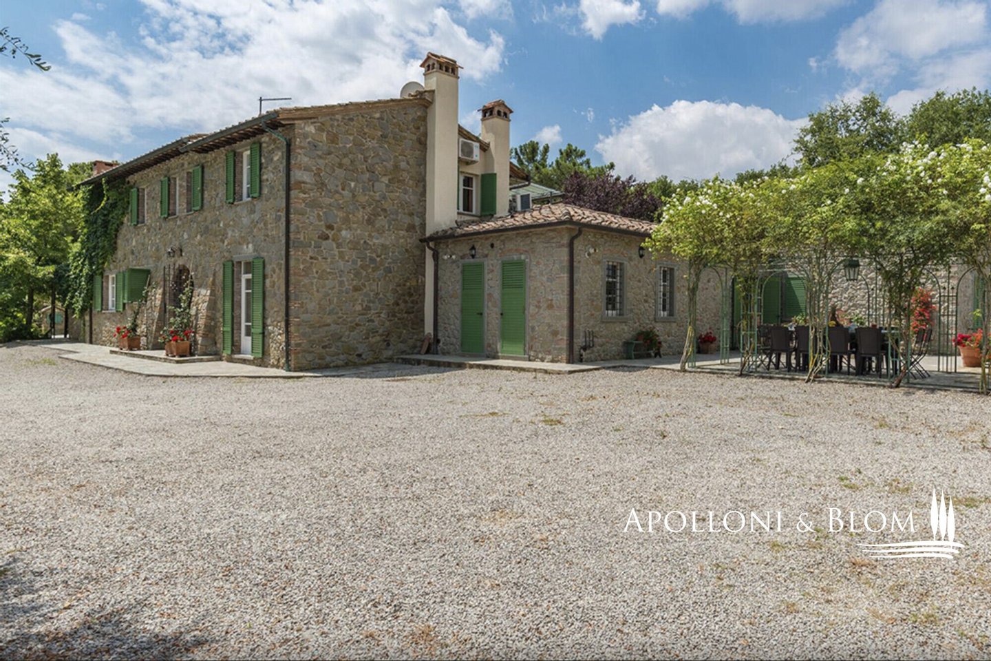 Perfekt restauriertes Bauernhaus aus Stein mit authentischem Charme, Klimaanlage, Schwimmbad, Olivenhain und geschützter Lage, zu verkaufen in Cortona. Strategisch gelegen, nur wenige Minuten von allen Dienstleistungen und dem historischen Zentrum von Cortona, ein Bauernhaus aus Stein aus dem frühen 19. Jahrhundert in einer reservierten Umgebung, umgeben von der Landschaft des Valdichiana. Jahrhundert, das im Jahr 2010 in eine elegante Landvilla umgewandelt wurde, verfügt über eine Fläche von 385 Quadratmetern, die sich auf zwei Hauptetagen und einen traditionellen Keller im Untergeschoss verteilen, und liegt auf einem privaten Grundstück von 9.600 Quadratmetern. Bei der Renovierung wurde die Authentizität des ursprünglichen Gebäudes mit seinen Steinfassaden, Terrakottaböden und freiliegenden Balken hervorgehoben, wobei die historischen Elemente bewahrt und moderne Annehmlichkeiten mit viel Feingefühl eingebaut wurden. Steinkamine und hohe Decken verleihen den Räumen Wärme und zeitlose ländliche Eleganz, während Fensterrahmen und Türen, die komplett durch Doppelverglasung ersetzt wurden, mit den traditionellen salbeigrünen Holzfensterläden der toskanischen Häuser harmonieren. Im Erdgeschoss befindet sich eine Eingangshalle, die zu einem Doppelwohnzimmer mit Steinkamin und einem Essbereich führt. Angrenzend befindet sich eine geräumige Küche im rustikalen Stil mit Kamin, die direkt mit dem Außenbereich mit Innenhof, Pavillon und Grill verbunden ist. Ein Service-Bad, Abstellräume und drei Doppelschlafzimmer, alle mit eigenem Bad, vervollständigen diese Ebene. Eine klassische Steintreppe führt in den ersten Stock, wo sich ein Hauptschlafzimmer mit eigenem Bad und Zugang zu einer privaten Terrasse mit Blick auf die Landschaft, zwei weitere Doppelschlafzimmer, eines mit Terrasse, ein Bad und ein Abstellraum befinden. Alle Räume sind klimatisiert. Im gepflegten Garten wechseln sich Rasenflächen, Blumenbeete, Pinien und hohe Bäume ab, die zu jeder Jahreszeit eine stimmungsvolle Kulisse bilden. In der Mitte befindet sich der Swimmingpool, der von einem eleganten Steinpflaster umrahmt ist, während sich jenseits des Gartens ein Olivenhain mit 100 Bäumen erstreckt, der der Anlage einen authentischen landwirtschaftlichen Charakter verleiht. Ein privater Brunnen speist die automatische Bewässerungsanlage. Heute wird das Anwesen von internationalen Reisenden gewählt, die einen raffinierten Rückzugsort für ihren Urlaub in der toskanischen Landschaft suchen, aber es eignet sich auch perfekt als eleganter privater Wohnsitz, der mit Familie und Freunden bewohnt werden kann.