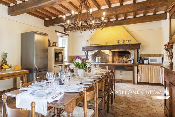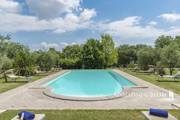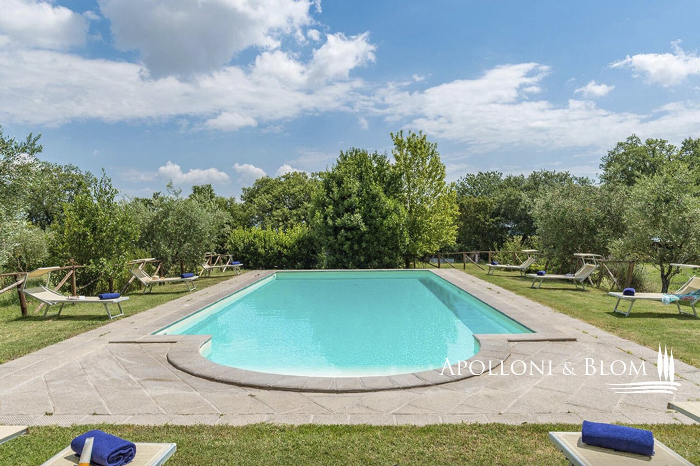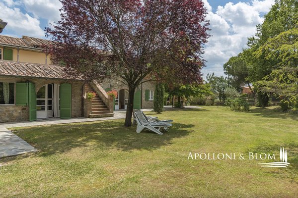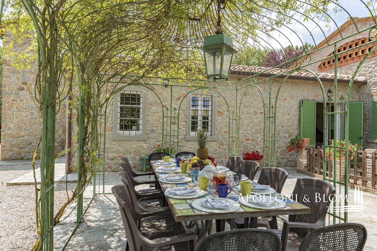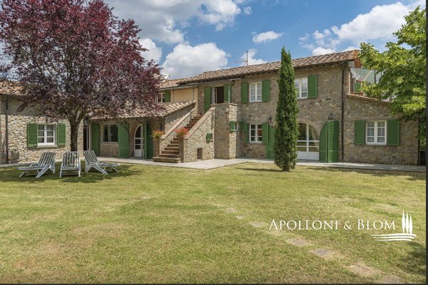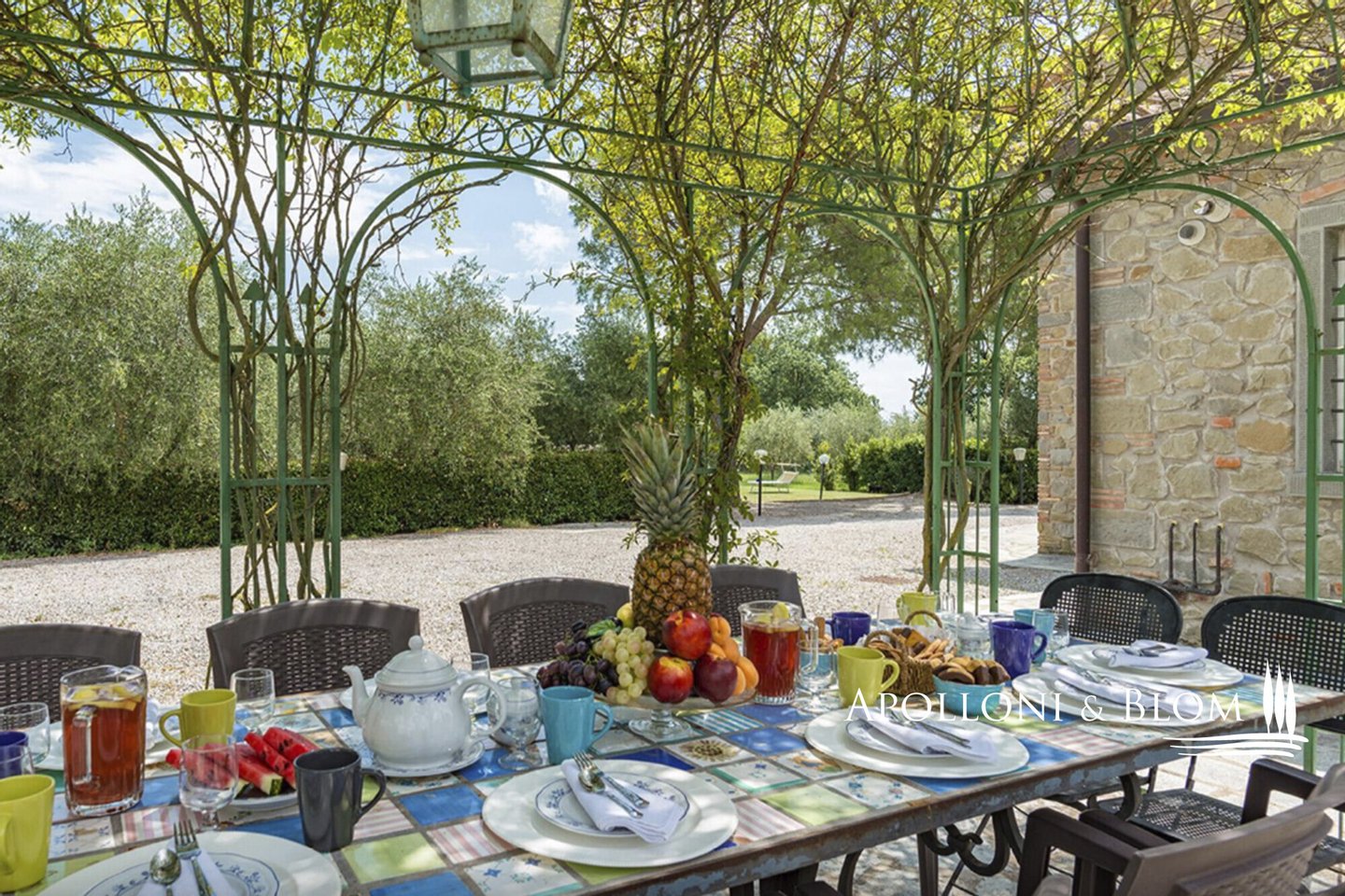 Perfekt restauriertes Bauernhaus aus Stein mit authentischem Charme, Klimaanlage, Schwimmbad, Olivenhain und geschützter Lage, zu verkaufen in Cortona. Strategisch gelegen, nur wenige Minuten von allen Dienstleistungen und dem historischen Zentrum von Cortona, ein Bauernhaus aus Stein aus dem frühen 19. Jahrhundert in einer reservierten Umgebung, umgeben von der Landschaft des Valdichiana. Jahrhundert, das im Jahr 2010 in eine elegante Landvilla umgewandelt wurde, verfügt über eine Fläche von 385 Quadratmetern, die sich auf zwei Hauptetagen und einen traditionellen Keller im Untergeschoss verteilen, und liegt auf einem privaten Grundstück von 9.600 Quadratmetern. Bei der Renovierung wurde die Authentizität des ursprünglichen Gebäudes mit seinen Steinfassaden, Terrakottaböden und freiliegenden Balken hervorgehoben, wobei die historischen Elemente bewahrt und moderne Annehmlichkeiten mit viel Feingefühl eingebaut wurden. Steinkamine und hohe Decken verleihen den Räumen Wärme und zeitlose ländliche Eleganz, während Fensterrahmen und Türen, die komplett durch Doppelverglasung ersetzt wurden, mit den traditionellen salbeigrünen Holzfensterläden der toskanischen Häuser harmonieren. Im Erdgeschoss befindet sich eine Eingangshalle, die zu einem Doppelwohnzimmer mit Steinkamin und einem Essbereich führt. Angrenzend befindet sich eine geräumige Küche im rustikalen Stil mit Kamin, die direkt mit dem Außenbereich mit Innenhof, Pavillon und Grill verbunden ist. Ein Service-Bad, Abstellräume und drei Doppelschlafzimmer, alle mit eigenem Bad, vervollständigen diese Ebene. Eine klassische Steintreppe führt in den ersten Stock, wo sich ein Hauptschlafzimmer mit eigenem Bad und Zugang zu einer privaten Terrasse mit Blick auf die Landschaft, zwei weitere Doppelschlafzimmer, eines mit Terrasse, ein Bad und ein Abstellraum befinden. Alle Räume sind klimatisiert. Im gepflegten Garten wechseln sich Rasenflächen, Blumenbeete, Pinien und hohe Bäume ab, die zu jeder Jahreszeit eine stimmungsvolle Kulisse bilden. In der Mitte befindet sich der Swimmingpool, der von einem eleganten Steinpflaster umrahmt ist, während sich jenseits des Gartens ein Olivenhain mit 100 Bäumen erstreckt, der der Anlage einen authentischen landwirtschaftlichen Charakter verleiht. Ein privater Brunnen speist die automatische Bewässerungsanlage. Heute wird das Anwesen von internationalen Reisenden gewählt, die einen raffinierten Rückzugsort für ihren Urlaub in der toskanischen Landschaft suchen, aber es eignet sich auch perfekt als eleganter privater Wohnsitz, der mit Familie und Freunden bewohnt werden kann.