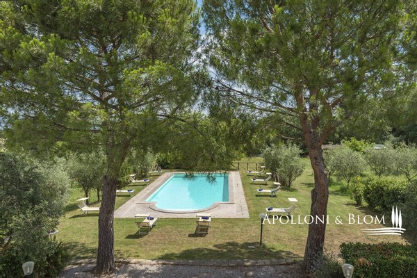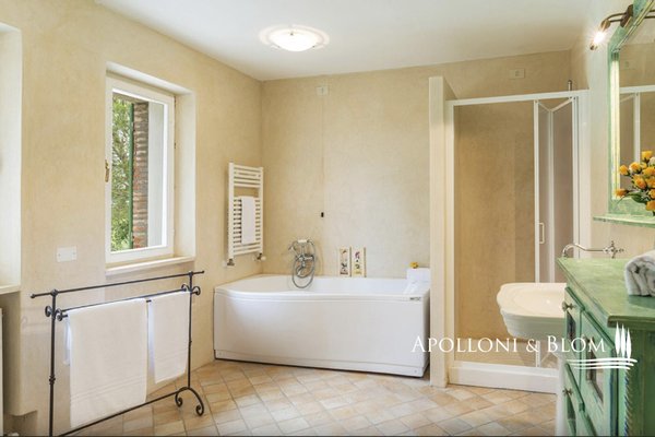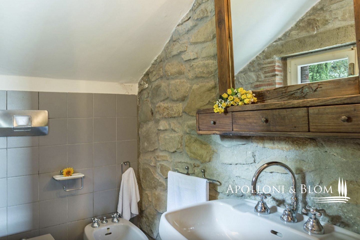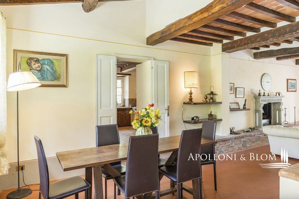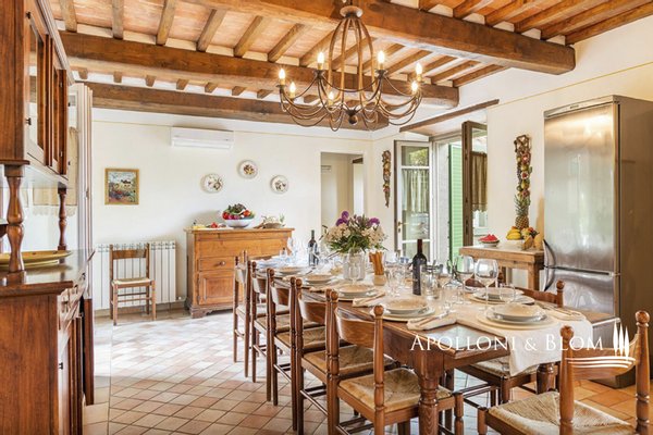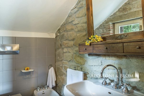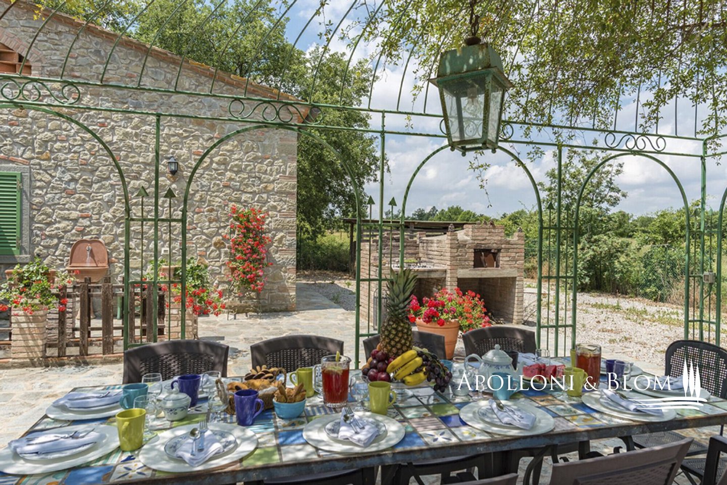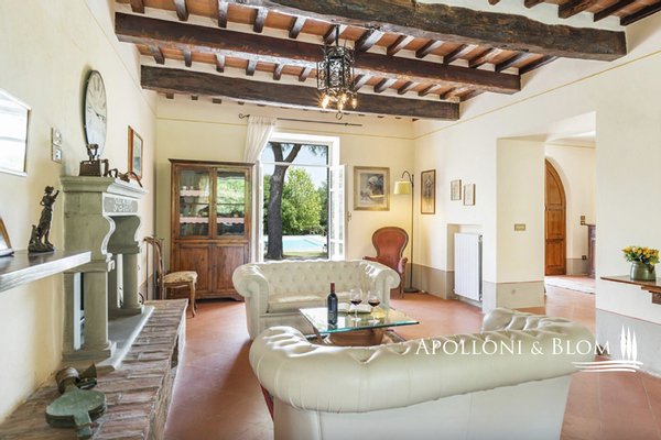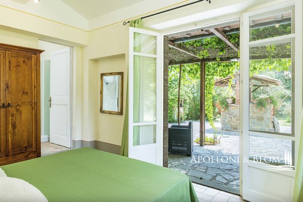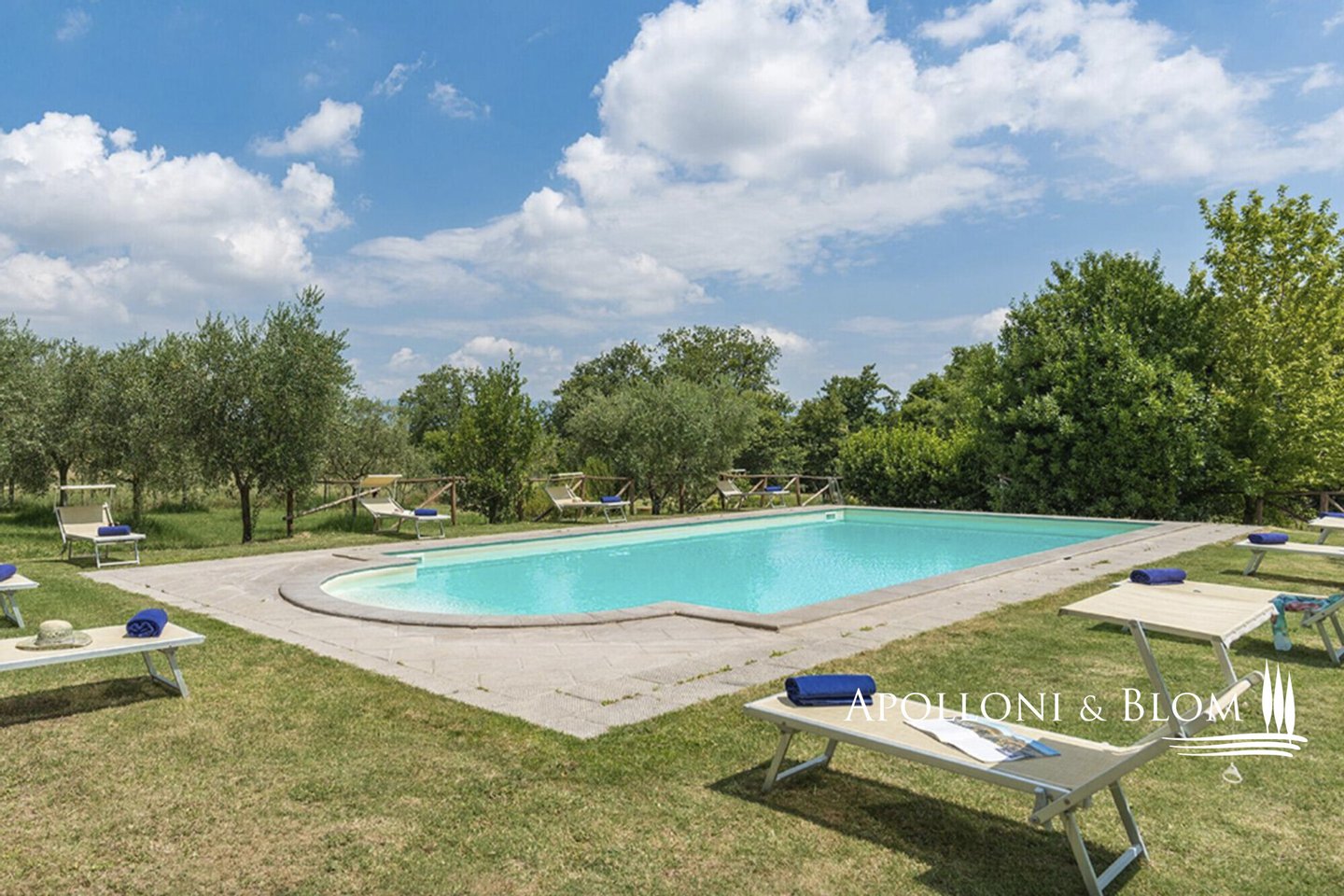 Perfekt restauriertes Bauernhaus aus Stein mit authentischem Charme, Klimaanlage, Schwimmbad, Olivenhain und geschützter Lage, zu verkaufen in Cortona. Strategisch gelegen, nur wenige Minuten von allen Dienstleistungen und dem historischen Zentrum von Cortona, ein Bauernhaus aus Stein aus dem frühen 19. Jahrhundert in einer reservierten Umgebung, umgeben von der Landschaft des Valdichiana. Jahrhundert, das im Jahr 2010 in eine elegante Landvilla umgewandelt wurde, verfügt über eine Fläche von 385 Quadratmetern, die sich auf zwei Hauptetagen und einen traditionellen Keller im Untergeschoss verteilen, und liegt auf einem privaten Grundstück von 9.600 Quadratmetern. Bei der Renovierung wurde die Authentizität des ursprünglichen Gebäudes mit seinen Steinfassaden, Terrakottaböden und freiliegenden Balken hervorgehoben, wobei die historischen Elemente bewahrt und moderne Annehmlichkeiten mit viel Feingefühl eingebaut wurden. Steinkamine und hohe Decken verleihen den Räumen Wärme und zeitlose ländliche Eleganz, während Fensterrahmen und Türen, die komplett durch Doppelverglasung ersetzt wurden, mit den traditionellen salbeigrünen Holzfensterläden der toskanischen Häuser harmonieren. Im Erdgeschoss befindet sich eine Eingangshalle, die zu einem Doppelwohnzimmer mit Steinkamin und einem Essbereich führt. Angrenzend befindet sich eine geräumige Küche im rustikalen Stil mit Kamin, die direkt mit dem Außenbereich mit Innenhof, Pavillon und Grill verbunden ist. Ein Service-Bad, Abstellräume und drei Doppelschlafzimmer, alle mit eigenem Bad, vervollständigen diese Ebene. Eine klassische Steintreppe führt in den ersten Stock, wo sich ein Hauptschlafzimmer mit eigenem Bad und Zugang zu einer privaten Terrasse mit Blick auf die Landschaft, zwei weitere Doppelschlafzimmer, eines mit Terrasse, ein Bad und ein Abstellraum befinden. Alle Räume sind klimatisiert. Im gepflegten Garten wechseln sich Rasenflächen, Blumenbeete, Pinien und hohe Bäume ab, die zu jeder Jahreszeit eine stimmungsvolle Kulisse bilden. In der Mitte befindet sich der Swimmingpool, der von einem eleganten Steinpflaster umrahmt ist, während sich jenseits des Gartens ein Olivenhain mit 100 Bäumen erstreckt, der der Anlage einen authentischen landwirtschaftlichen Charakter verleiht. Ein privater Brunnen speist die automatische Bewässerungsanlage. Heute wird das Anwesen von internationalen Reisenden gewählt, die einen raffinierten Rückzugsort für ihren Urlaub in der toskanischen Landschaft suchen, aber es eignet sich auch perfekt als eleganter privater Wohnsitz, der mit Familie und Freunden bewohnt werden kann.