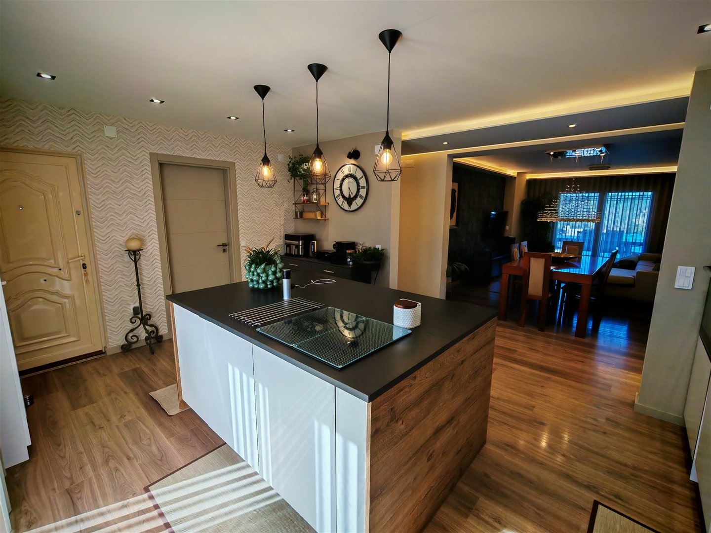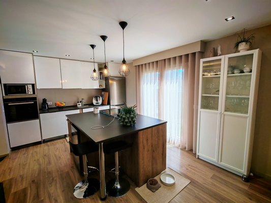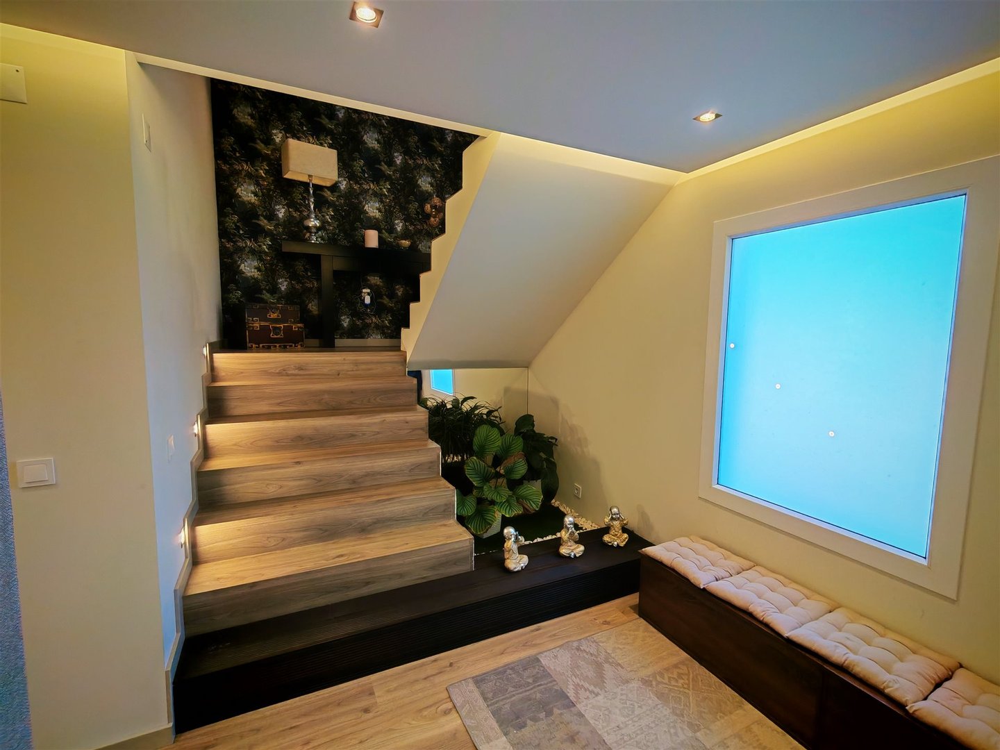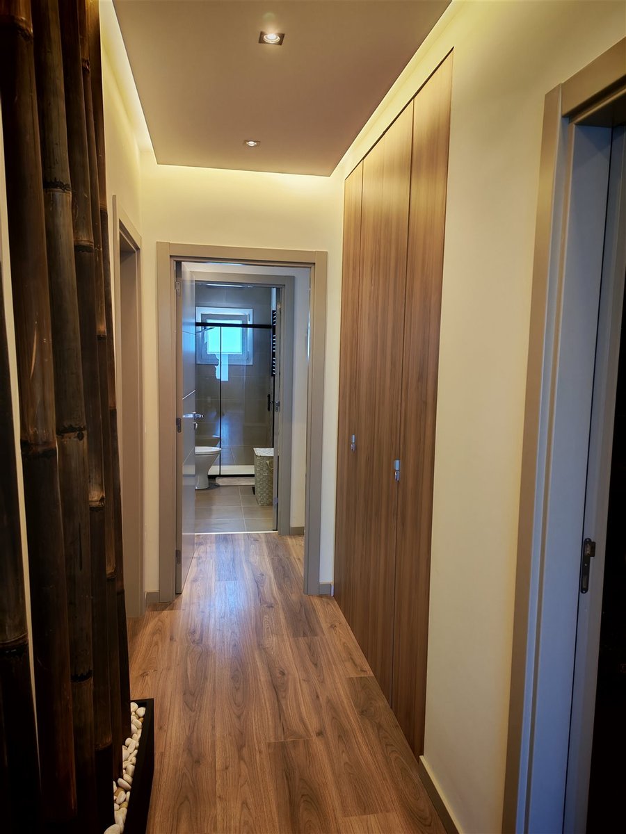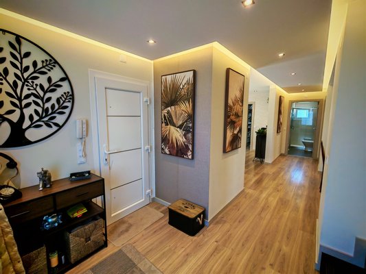 Helle Räume: Der Eingangsbereich ist einladend und beruhigend, führt zu eleganten Treppen, die ins Obergeschoss führen. Die Küche, offen zum Wohnzimmer, verfügt außerdem über eine Speisekammer/Waschküche mit direktem Ausgang nach außen.